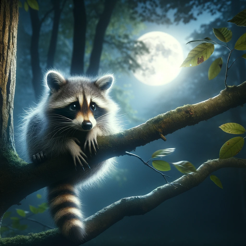 In the serene quiet of the woodland, under the enchanting glow of the moonlight, a raccoon perches playfully upon a tree branch. Its eyes, aglow with the spark of curiosity, reflect the mystique of the night. Amidst the tranquil ambiance, nature’s whimsy dances with the raccoon’s playful spirit, crafting a scene of whimsical allure and nocturnal charm.