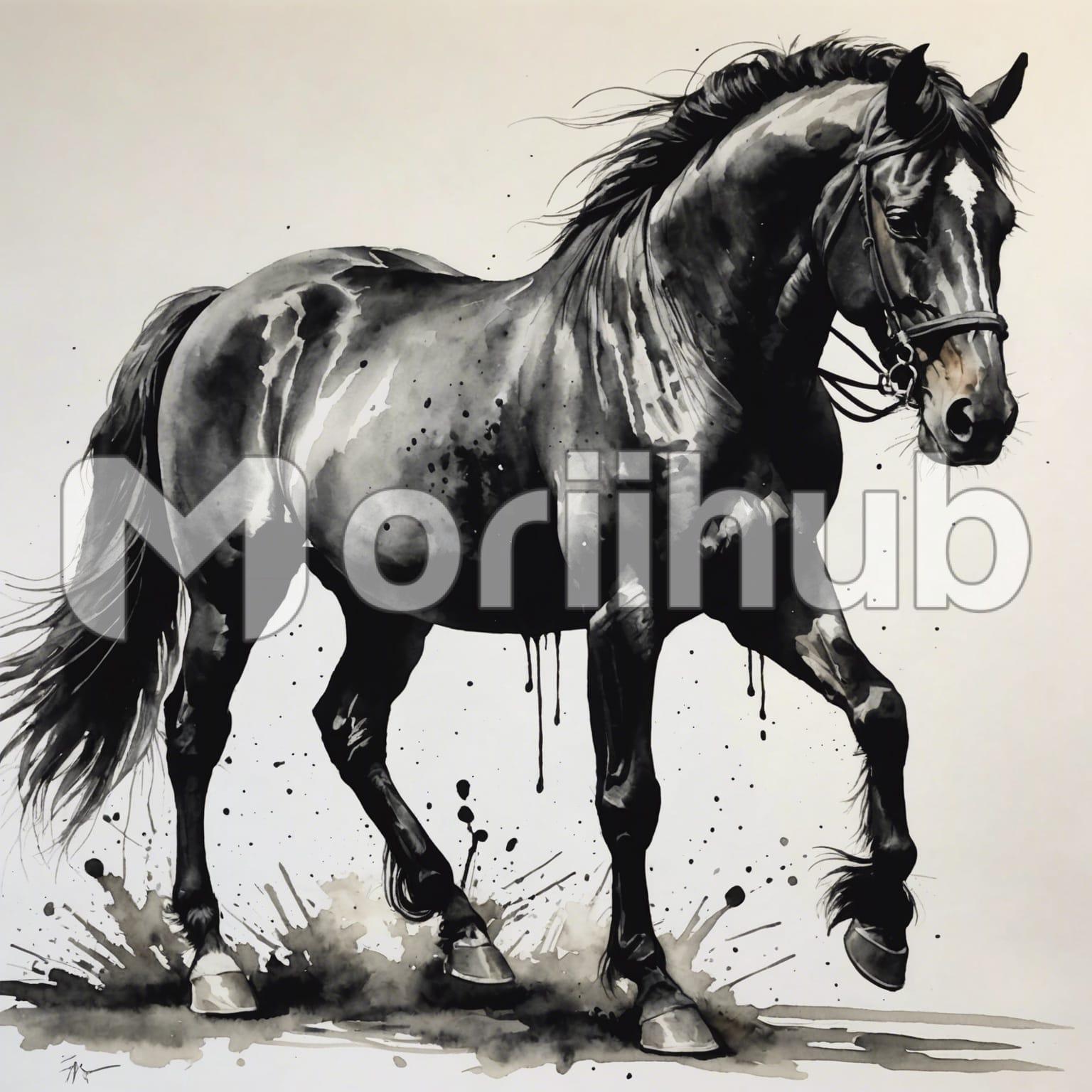 In an ink painting, the horse emerges from swirling shadows, its powerful form captured in bold strokes of black. Each line, meticulously drawn, conveys the grace and strength of this majestic creature. With a flowing mane and determined gaze, it seems to gallop across the canvas, evoking a sense of movement and vitality. The simplicity of black ink against white space enhances the horse’s presence, emphasizing its beauty and spirit. In this artwork, the artist has masterfully captured the essence of the horse, immortalizing its timeless allure on paper.