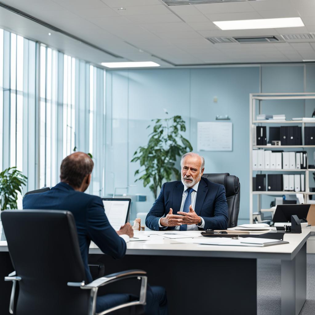 In this contemporary office space, a sleek and minimalist design sets the tone for professionalism. A large, polished desk dominates the room, where the boss sits confidently in a tailored suit, surrounded by cutting-edge technology. Across from him, a male employee mirrors the sophistication in his own suit, engaged in a focused conversation. The atmosphere is a blend of efficiency and style, reflecting the dynamic nature of the workplace where collaboration and innovation seamlessly coexist.