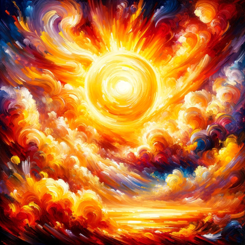 In a breathtaking display of vibrant hues, an impressionistic painting captures the essence of the sun. Fiery strokes dance across the canvas, emanating its radiant energy with bold expressiveness. Each brushstroke conveys the sun’s fiery intensity, while splashes of color evoke its dynamic and ever-changing nature, mesmerizing viewers with its celestial beauty.