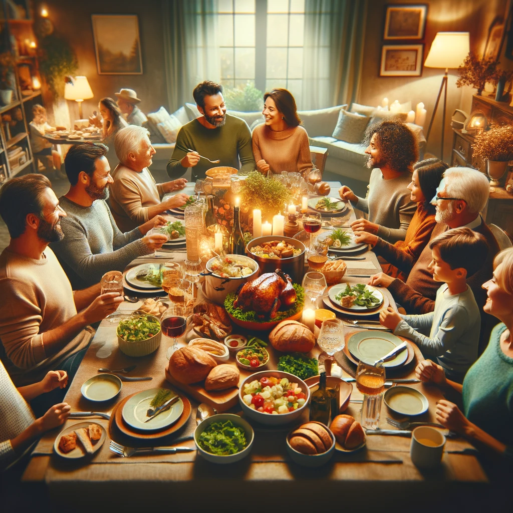 Gather ’round a warm and inviting scene of familial love, where the essence of togetherness is captured in the glow of a family dinner. Around a large dining table, loved ones share laughter and stories, savoring the comfort of home-cooked meals that nourish both body and soul.