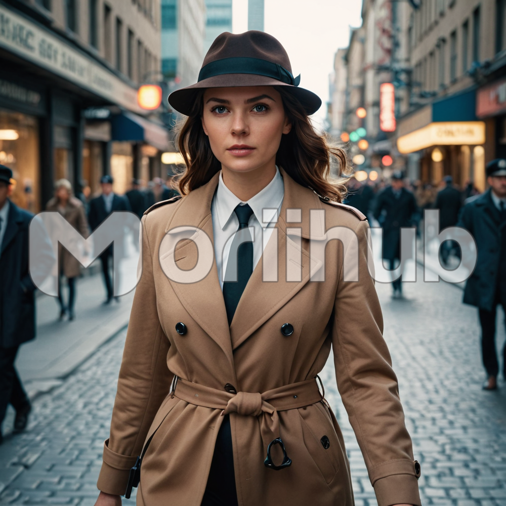 Amidst the bustling street, a beautiful woman strides with grace, donning an elegant overcoat and chic hat. Her attire exudes sophistication, complementing her poise and confidence with every step. The fabric of her coat billows lightly in the breeze, accentuating her graceful movement. With a tilt of her hat, she exudes an air of mystery, captivating the attention of those around her. In this urban tableau, she stands out as a beacon of style and elegance, a vision of timeless beauty amidst the rhythm of the city.