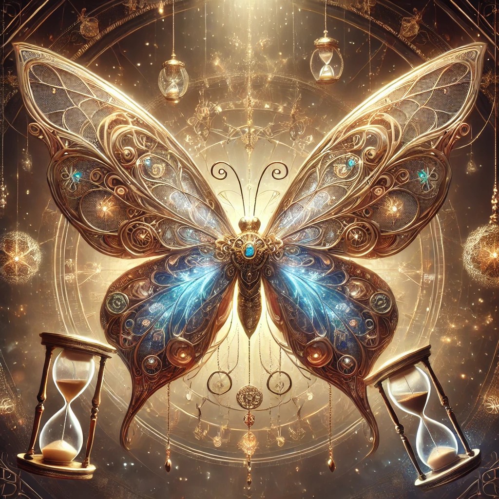 The artwork features an enchanting fate butterfly automaton, a perfect fusion of intricate mechanical artistry and the mystical essence of destiny. Its metallic wings, semi-translucent and delicately detailed, are adorned with glowing threads of light and golden filigree patterns, forming an intricate web that symbolizes the interwoven paths of fate. The edges of the wings shimmer and shift between silver and gold hues, evoking the fluidity and unpredictability of destiny’s design.