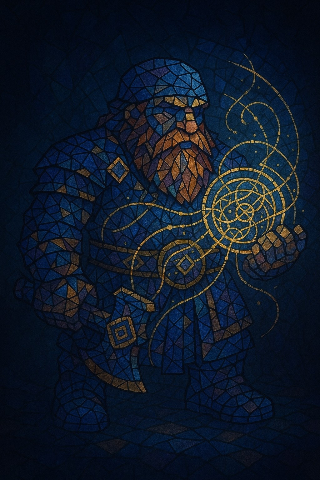 This artwork depicts a fantasy dwarf rendered entirely in a digital abstract mosaic style, reminiscent of stained glass. His form is built from small, angular shards of deep blues, purples, and warm golds. The dwarf stands solid and powerful, with a full, reddish-orange beard and a determined expression. His armor is decorated with geometric patterns, and he grips a sturdy axe in one hand. In his other hand, the “fate” element is represented as glowing golden spirals and intricate rune-like lines, which swirl outward in a complex web, suggesting destiny’s threads.