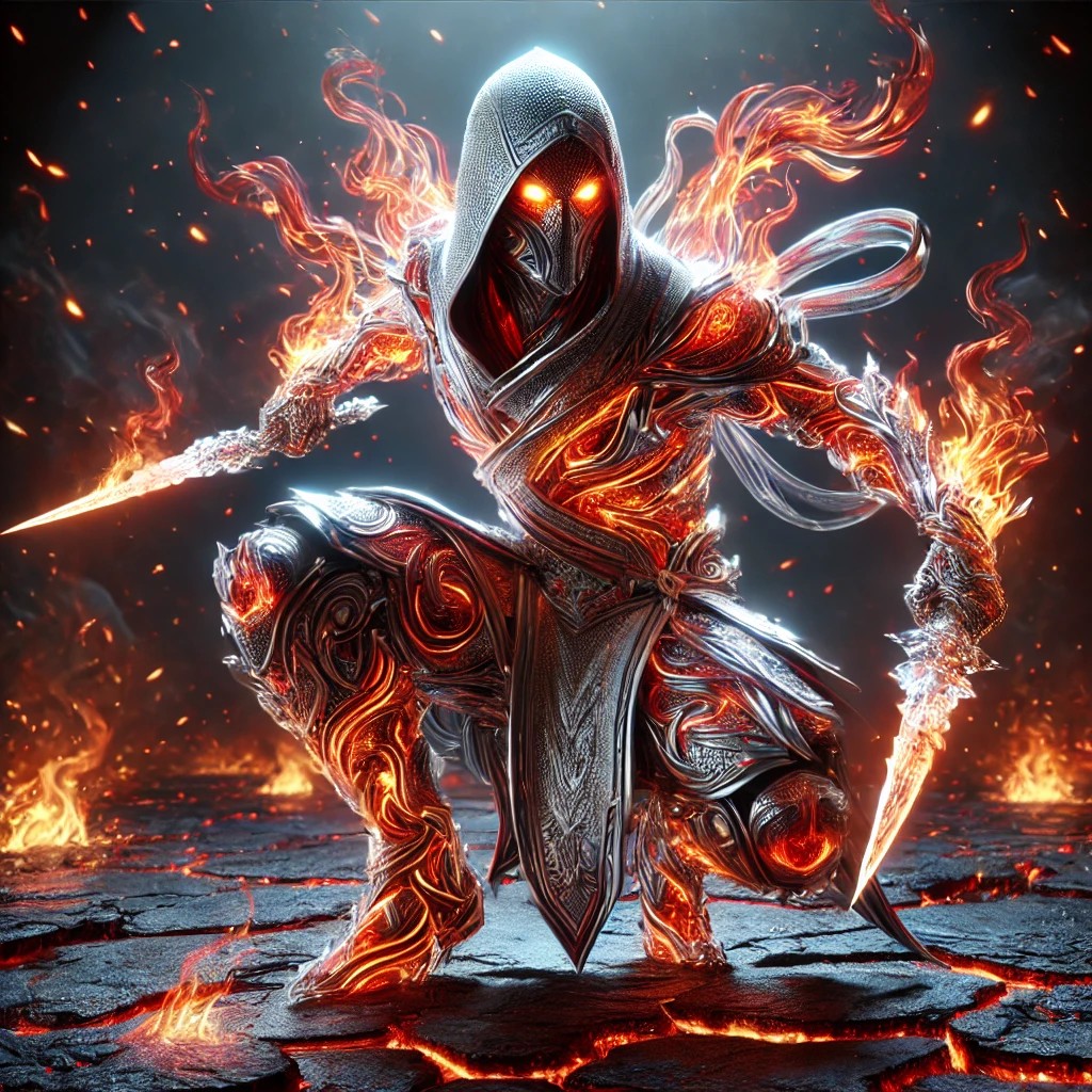 A stealthy assassin sculpted entirely from translucent crystal, infused with the fire element. The figure glows in shades of red, orange, and silver, radiating intense heat and elemental energy. The assassin is crouched in a dynamic pose, holding twin crystal daggers that pulse with fiery light. Flames wrap around the arms and legs, and glowing ember patterns are etched into the armor. The eyes glow with fierce intent.