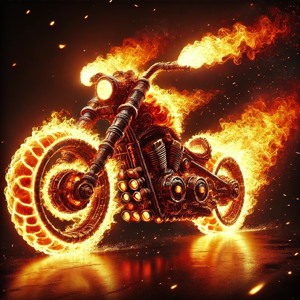 Motorcycle forged entirely from flames and intense heat. The body of the bike is made of roaring fire, with the frame appearing as though it’s constructed from molten metal, glowing with a red-hot intensity. The wheels are spinning, fiery orbs, leaving trails of sparks and embers as they turn.