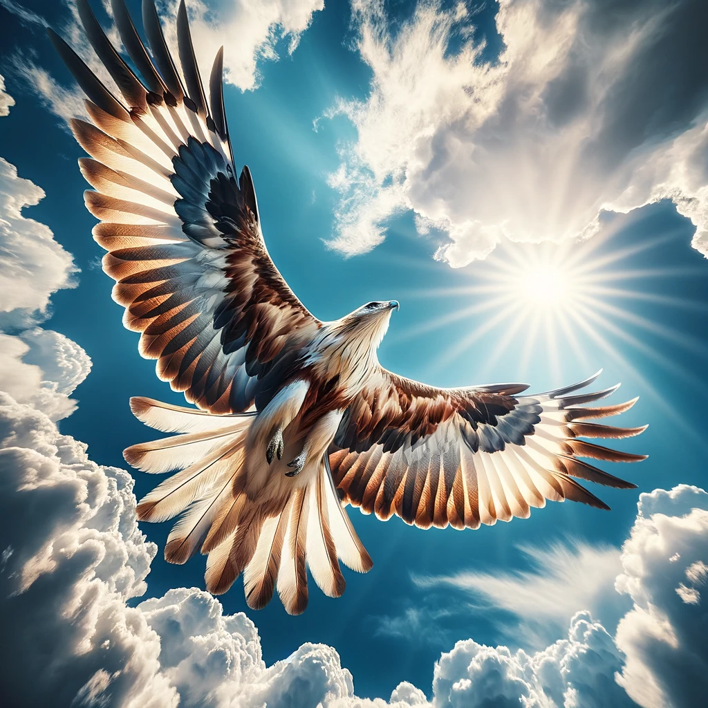 In this awe-inspiring scene, a majestic bird soars gracefully across the boundless expanse of a brilliant blue sky. Viewed from below, its wings outstretched in flight, it embodies freedom and strength. The sky, painted in hues of azure, is adorned with a scattering of fluffy white clouds, adding to the sense of wonder and serenity as the bird effortlessly traverses the heavens.