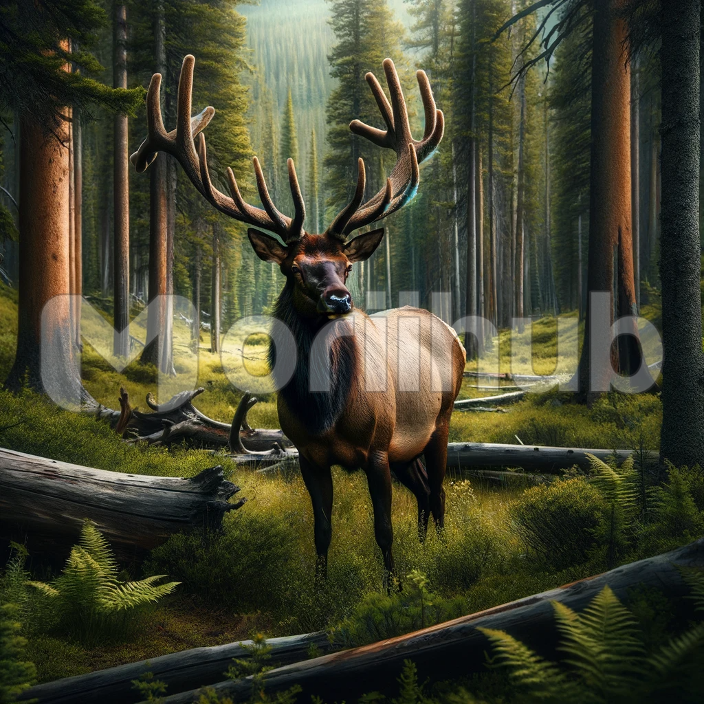 In a serene forest clearing, a majestic elk commands attention with its awe-inspiring presence. This magnificent creature boasts a large and impressive frame, standing tall and powerful. Its antlers, a testament to its regal stature, spread wide and intricate, resembling a natural crown. With regal grace, the elk epitomizes the untamed grandeur of the wilderness.