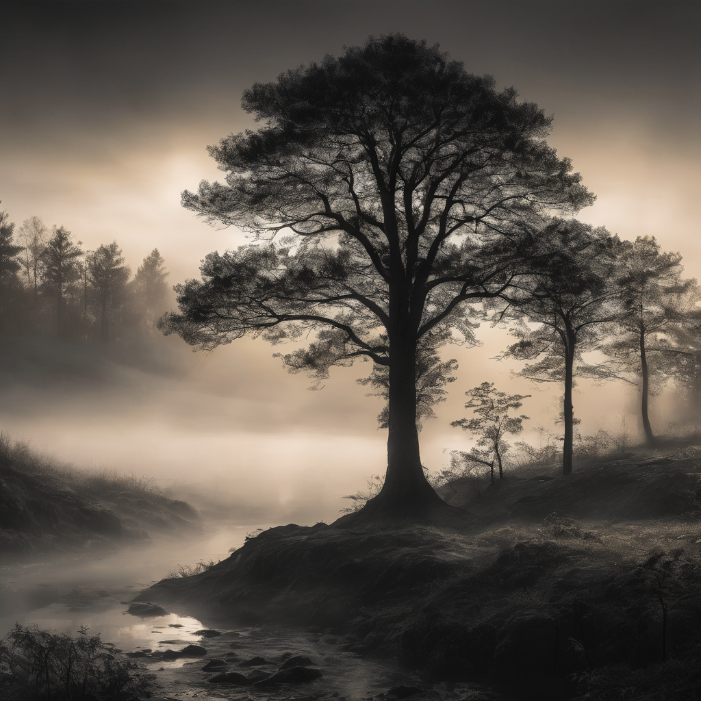 In a monochrome dreamscape, a misty forest emerges, its ancient trees shrouded in ethereal fog. A river winds through the heart of this enigmatic realm, its waters flowing silently amidst the veiled landscape. The absence of color heightens the sense of mystery and tranquility, inviting contemplation of unseen depths. In this serene setting, nature’s whispers echo through the mist, weaving a timeless tale of solitude and serenity.