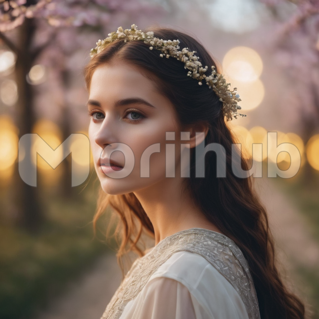 A breathtaking woman, adorned with a floral laurel crown, turns gracefully to gaze over her shoulder. Her enchanting allure is accentuated by a backdrop of peach blossoms in full bloom. Petals dance in the breeze, framing her in a delicate cascade of pastel colors. Her profile exudes timeless beauty, a harmonious blend of nature’s grace and the elegance of a goddess, captured in a mesmerizing moment amidst the blooming orchard.