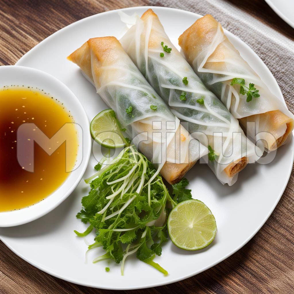 A plate adorned with tempting spring rolls unveils a culinary masterpiece. Each golden roll promises a crispy exterior, concealing a medley of fresh herbs within. Vibrant lemon slices grace the ensemble, offering a citrusy touch. Adjacent, a tantalizing dipping sauce beckons from the corner, adding an extra layer of flavor. The scene embodies a symphony of textures and flavors, inviting a culinary journey through the delightful world of spring roll perfection.