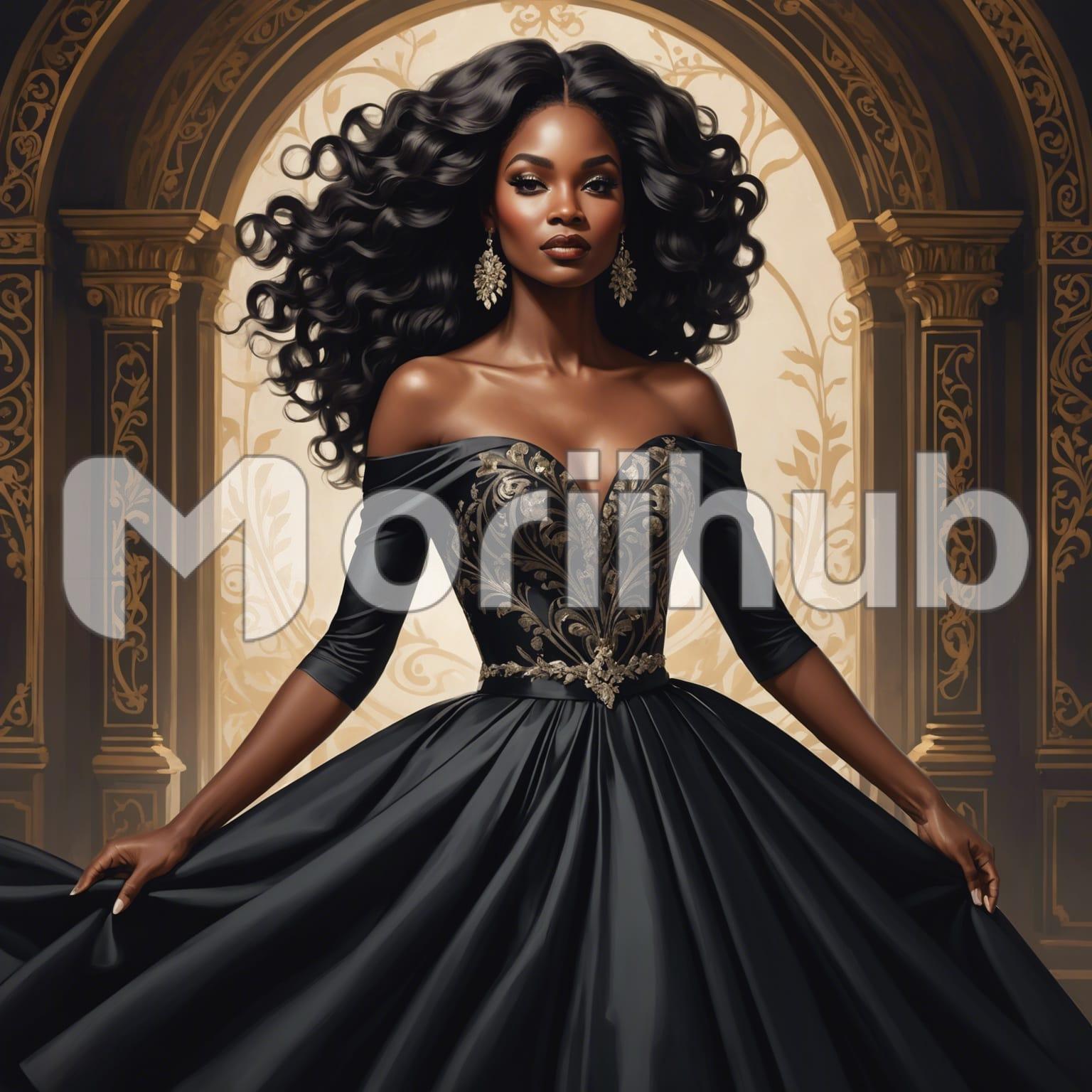 In resplendent elegance, a stunning ebony woman graces the scene, her presence commanding attention as she dons a breathtaking gown. The fabric cascades in luxurious folds, embracing her form with grace and sophistication. Against her radiant skin, the gown’s intricate details shimmer like starlight, casting a mesmerizing glow. With each step, she exudes confidence and poise, a vision of beauty and strength. In her timeless elegance, she embodies the essence of regal grace, captivating all who have the privilege of beholding her.