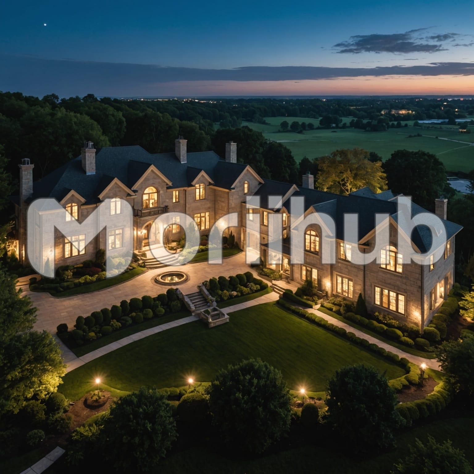 From above, a sprawling estate unfolds in breathtaking detail. The expansive property features meticulously manicured lawns, winding pathways, and lush gardens. The main building stands majestically at the center, its grand architecture illuminated by lights glowing warmly from within. Surrounding structures, possibly guest houses or recreational facilities, complement the grandeur of the estate. Trees and shrubs dot the landscape, adding to the natural beauty. The illuminated windows create a welcoming ambiance, hinting at the elegance and comfort inside. The scene exudes luxury, tranquility, and timeless charm.