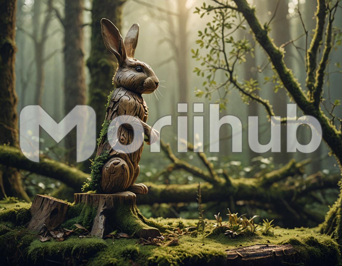 Picture a beautifully carved wooden rabbit sitting quietly in the heart of a lush meadow. The rabbit, crafted with intricate detail, captures the essence of nature in its lifelike form. Its smooth, polished wood contrasts with the soft, green grass that surrounds it, blending harmoniously with the natural environment. The rabbit’s features—its delicate ears, gentle eyes, and poised stance—are masterfully carved, giving it a sense of quiet alertness, as if it could spring to life at any moment. Wildflowers bloom around the wooden sculpture, their vibrant colors highlighting the craftsmanship and adding a touch of whimsy to the scene.