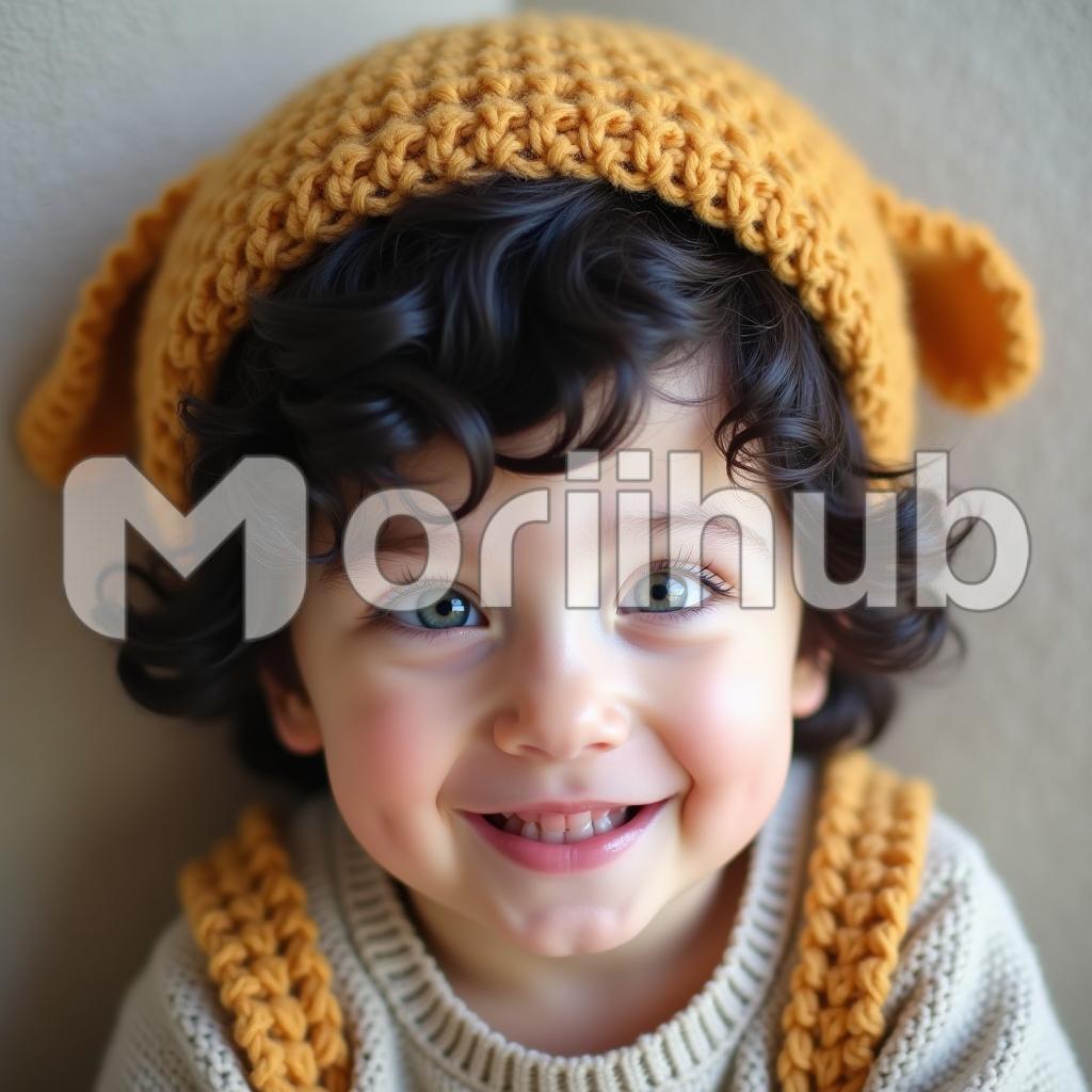 A cute little boy stands, his face lit up by a soft, gentle smile that exudes warmth and innocence. He wears a cozy crochet hat, its soft yarn adding a touch of handmade charm to his look. The hat fits snugly over his head, framing his bright eyes and rosy cheeks. His smile is subtle yet heartwarming, as if he’s holding onto a happy thought or quiet secret. The simplicity of his outfit, combined with the softness of his expression, creates an endearing image of pure childhood sweetness and joy.