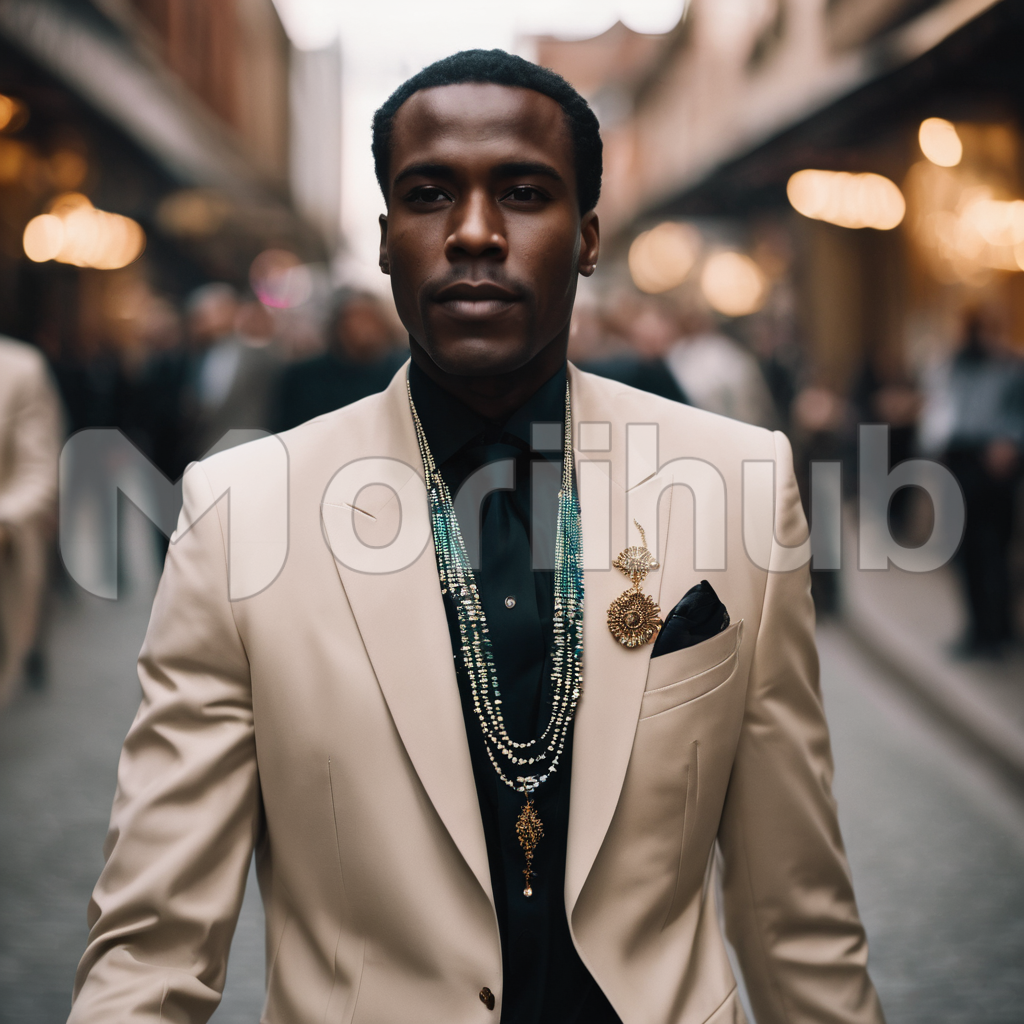 Amidst the bustling streets, a black man exudes confident elegance. He wears a impeccably tailored suit, its lines defining his stature. Around his neck, a beaded neckpiece adds a touch of cultural richness to his ensemble. With each stride, he moves with purpose, a fusion of style and heritage. In the urban milieu, his presence is a striking blend of modern sophistication and a celebration of tradition, captivating the onlookers with his grace.