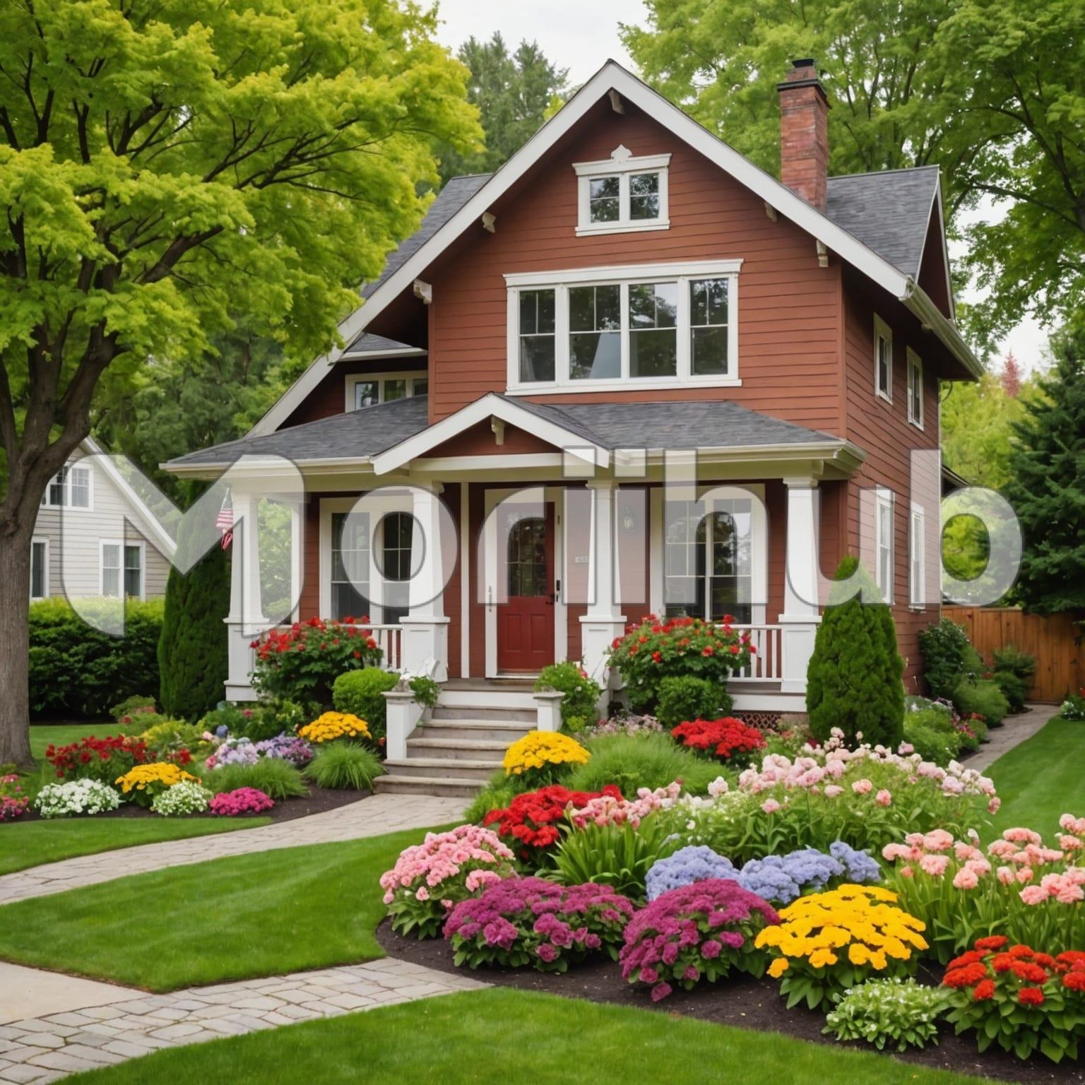 The quaint house sits peacefully, exuding charm and warmth. Its exterior is well-kept, with a manicured lawn stretching out in front, a vibrant green carpet dotted with colorful flowers in full bloom. Behind the house, lush greenery forms a natural backdrop, adding a sense of tranquility to the scene. The flowers add splashes of color, making the entire setting feel inviting and serene, a perfect picture of homely bliss.