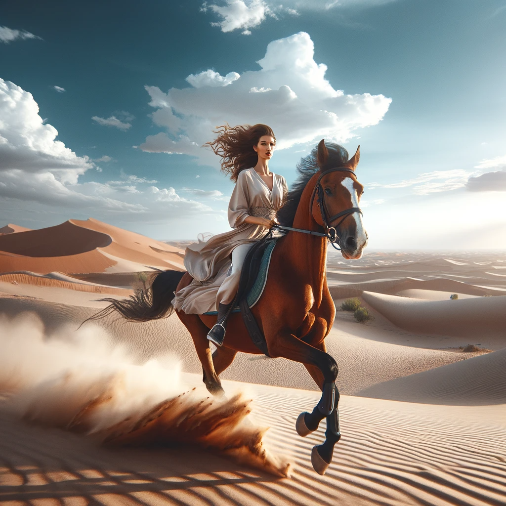 Amidst the vast and untamed desert, a lady gracefully rides a magnificent horse. Her flowing, billowing outfit, designed for the rigors of horseback riding, dances in the wind as she navigates the golden dunes. The striking contrast between her elegance and the rugged desert landscape creates a truly mesmerizing and timeless image.