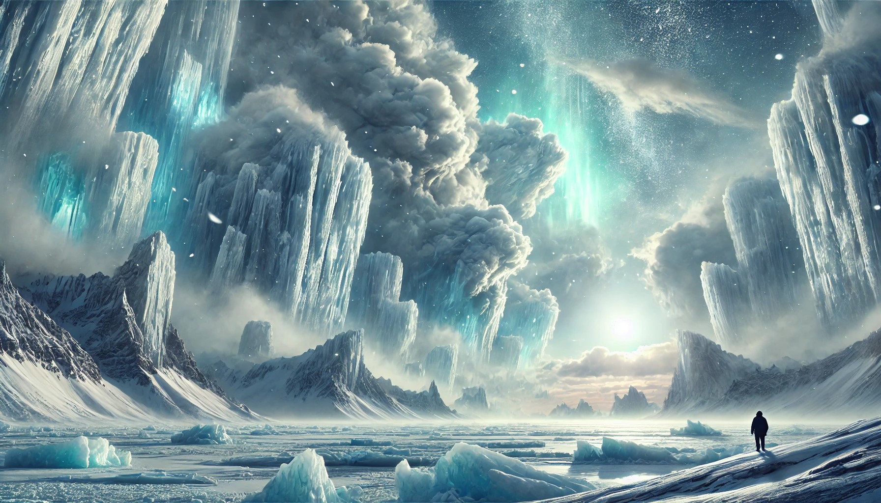 A frozen, crystalline sky filled with shades of icy blue, white, and pale silver. Massive, jagged ice formations float in the sky like glaciers, with frozen mist swirling around them. The air is sharp and cold, and the sun is a dim, distant light, barely breaking through thick, frosty clouds. Snowflakes fall gently, sparkling in the faint sunlight, and frozen auroras glow softly across the horizon. Below, the landscape is covered in endless ice plains, and towering icebergs rise from the ground, mirroring the frozen sky.