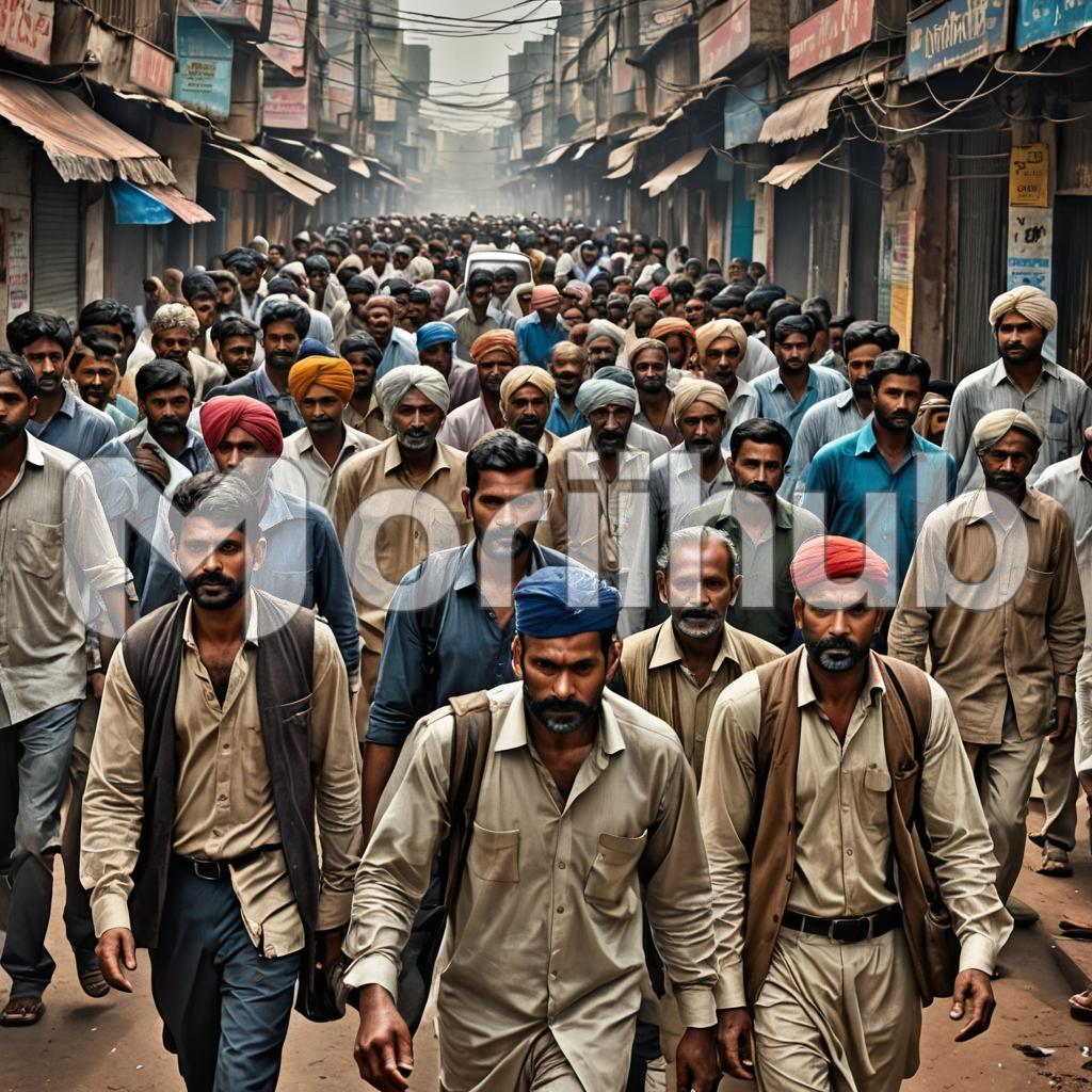 A lively street scene in India with men dressed in both traditional and modern clothing. They walk, talk, and engage with each other, capturing the vibrant essence of everyday life amidst bustling streets and colorful surroundings.