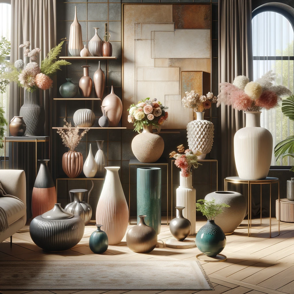 In this elegant interior setting, a modern living room is adorned with a carefully curated collection of vases, each one adding a touch of sophistication to the space. Against the backdrop of sleek furniture and minimalist decor, the vases stand as sculptural accents, showcasing their beauty and enhancing the room’s contemporary aesthetic.