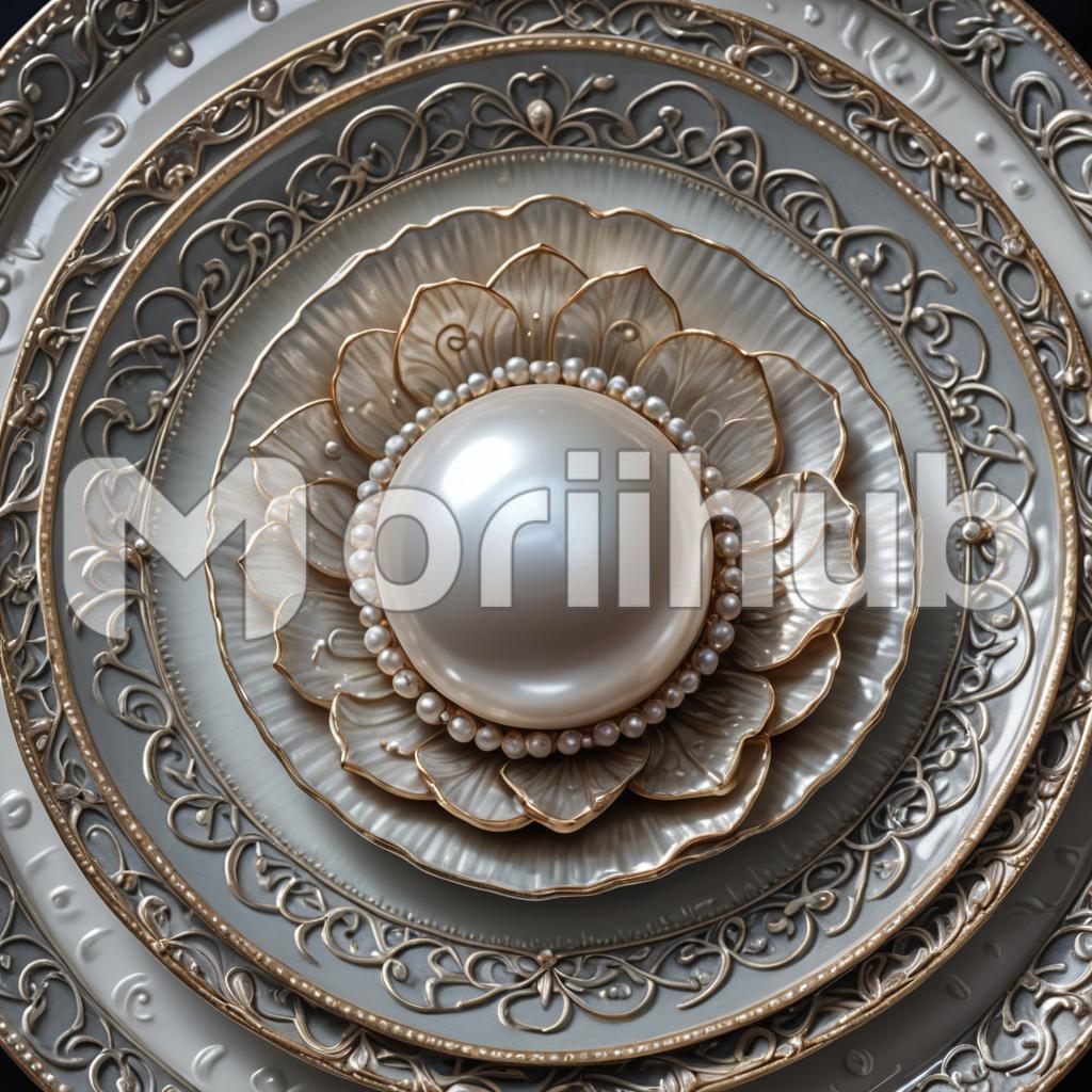 A close-up of a luminous pearl resting elegantly on a decorative plate. The pearl glows softly, reflecting shades of white and silver, highlighting its smooth, iridescent surface. The scene conveys elegance and simplicity, emphasizing the pearl’s natural beauty.