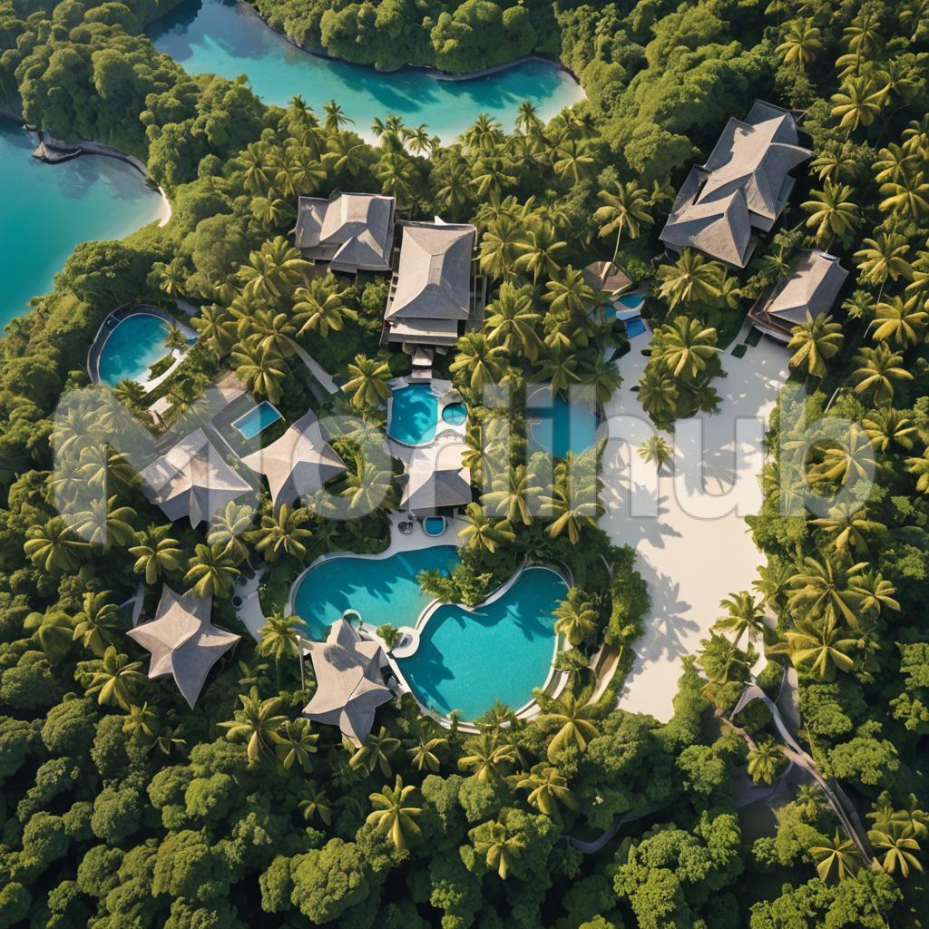 Nestled within a lush, verdant landscape, the resort offers a serene escape from the everyday hustle. Surrounded by dense tropical foliage, the property is designed to blend seamlessly with its natural environment. Luxurious villas and suites, adorned with open-air designs and panoramic windows, provide stunning views of the vibrant greenery and tranquil gardens. The sound of cascading waterfalls and chirping birds creates a soothing soundtrack, while the resort’s infinity pool appears to merge with the surrounding jungle. Pathways meander through beautifully landscaped gardens, leading to private retreats and outdoor lounges where guests can unwind amidst nature’s beauty. This idyllic setting promises relaxation and rejuvenation in an enchanting, tropical paradise.