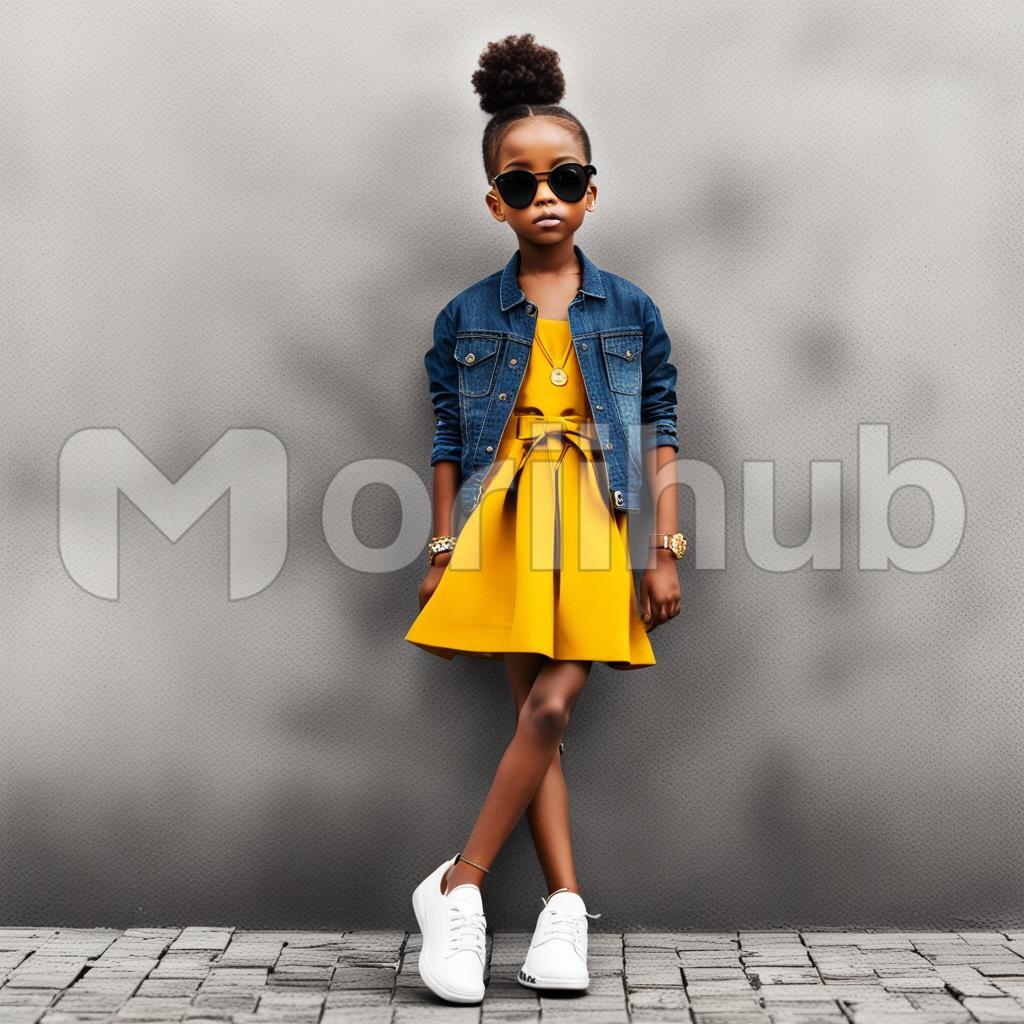 A little fashionista steals the spotlight in a vibrant ensemble. Adorned in a sunny yellow gown paired with a stylish denim jacket, she exudes playful sophistication. Completing the look with dark sunglasses, she strikes a pose, a pint-sized icon of youthful flair, blending chic and charm in a delightful fashion moment.