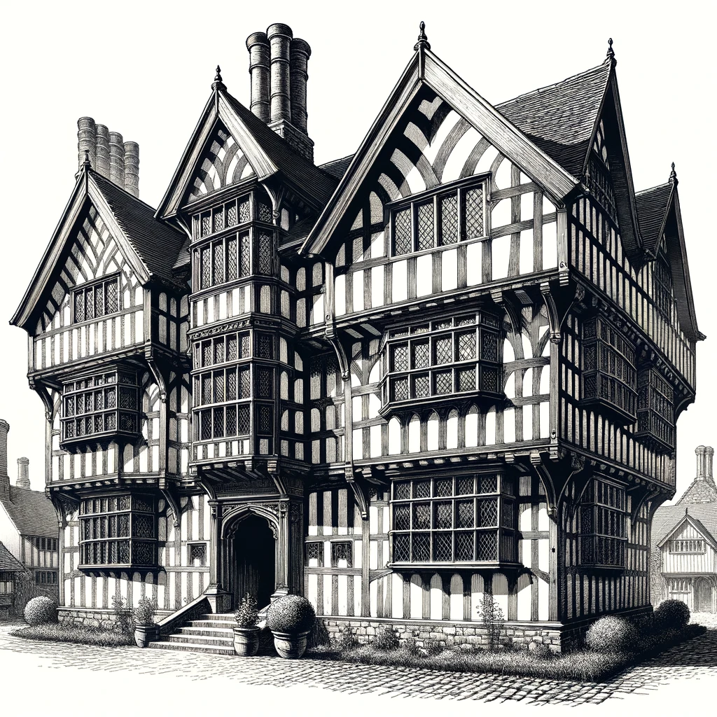Standing proudly in the UK, a historic building from the year 1520 exhibits Tudor architectural style, characterized by its distinctive half-timbered façade. The structure features exposed wooden beams with intricate carvings, contrasting against whitewashed plaster walls. Ornate gables and leaded windows add to its charm, offering a glimpse into England’s rich cultural heritage.
