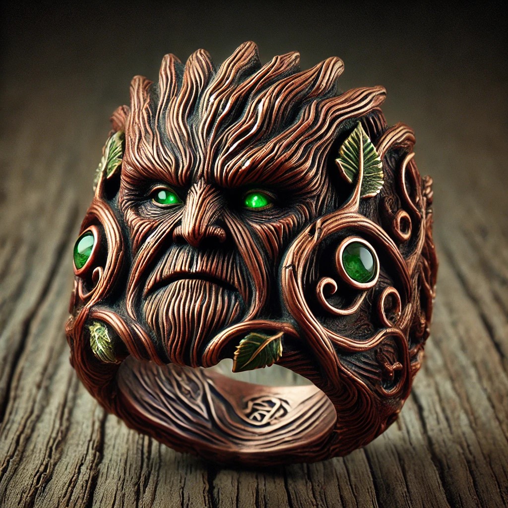 The Life Ent Ring is crafted from earthy-toned metal, resembling ancient, weathered wood bark. At the top of the ring is the wise, aged face of an Ent, with deep-set eyes that glow faintly green, symbolizing its profound connection to nature and life. The Ent’s twisted, root-like limbs wrap around the band, creating an organic, flowing design. Intricate leaf and vine patterns are etched along the body of the ring, adding a sense of vitality and movement. Small green gemstone inlays are embedded in the band, representing the life force of the forest.