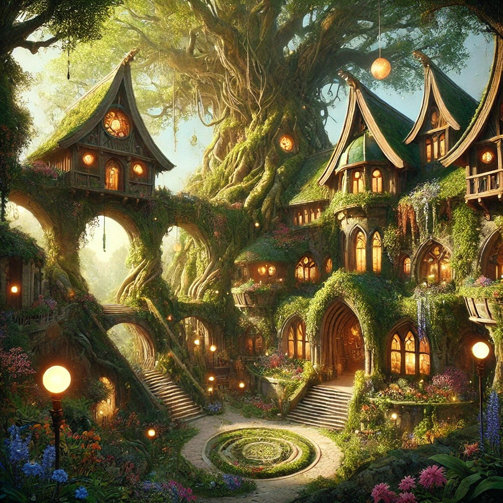 A Life Magic School stands at the heart of a vibrant, enchanted forest, surrounded by towering trees and blooming flowers. The school is a beautiful structure made of living wood and stone, with walls covered in ivy, flowers, and moss that seem to pulse with life. The buildings have natural, organic shapes, with large windows that allow sunlight to stream in, creating a warm and inviting atmosphere. The entrance is framed by two ancient oak trees, their branches forming an archway that leads into the school.
