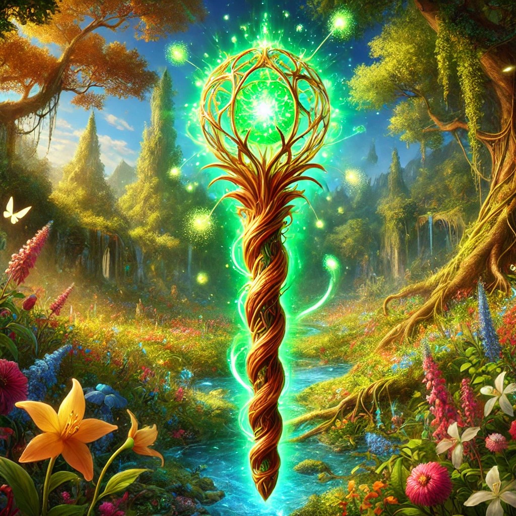 The wand is vibrant and full of energy, made from a living, organic material that pulses with life. Its surface is covered in a delicate network of vines and blooming flowers, with tiny leaves that seem to grow and shift as you observe them. The wand is slender but strong, with a warm, golden-brown hue that feels nurturing and alive. At the tip, a glowing orb of radiant green light hovers, surrounded by floating particles of pollen or glowing spores, symbolizing the essence of life.