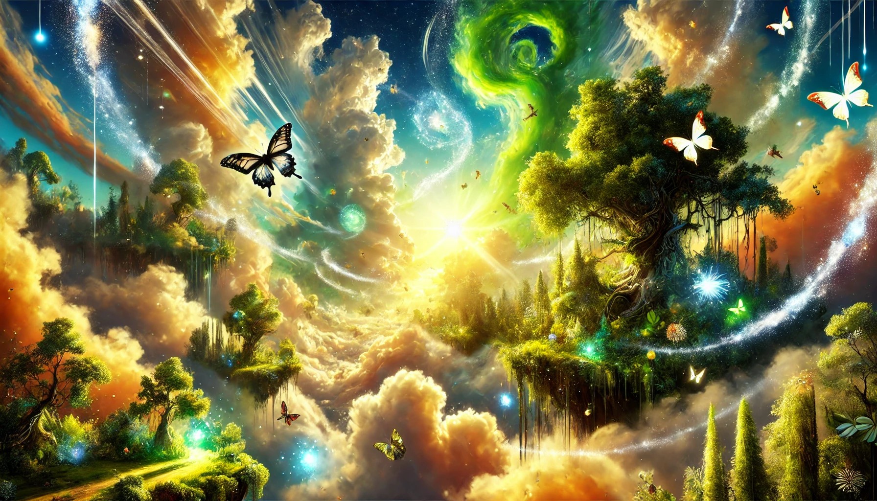 A vibrant, radiant sky teeming with life and energy. Swirling clouds of vivid colors—green, gold, and bright blue—merge with beams of sunlight that seem to pulse with vitality. Floating islands are covered in lush forests, teeming with diverse creatures. Birds, butterflies, and glowing insects soar through the air, leaving trails of light. Enormous trees rise into the sky, their branches intertwining with the clouds, bearing glowing fruit.