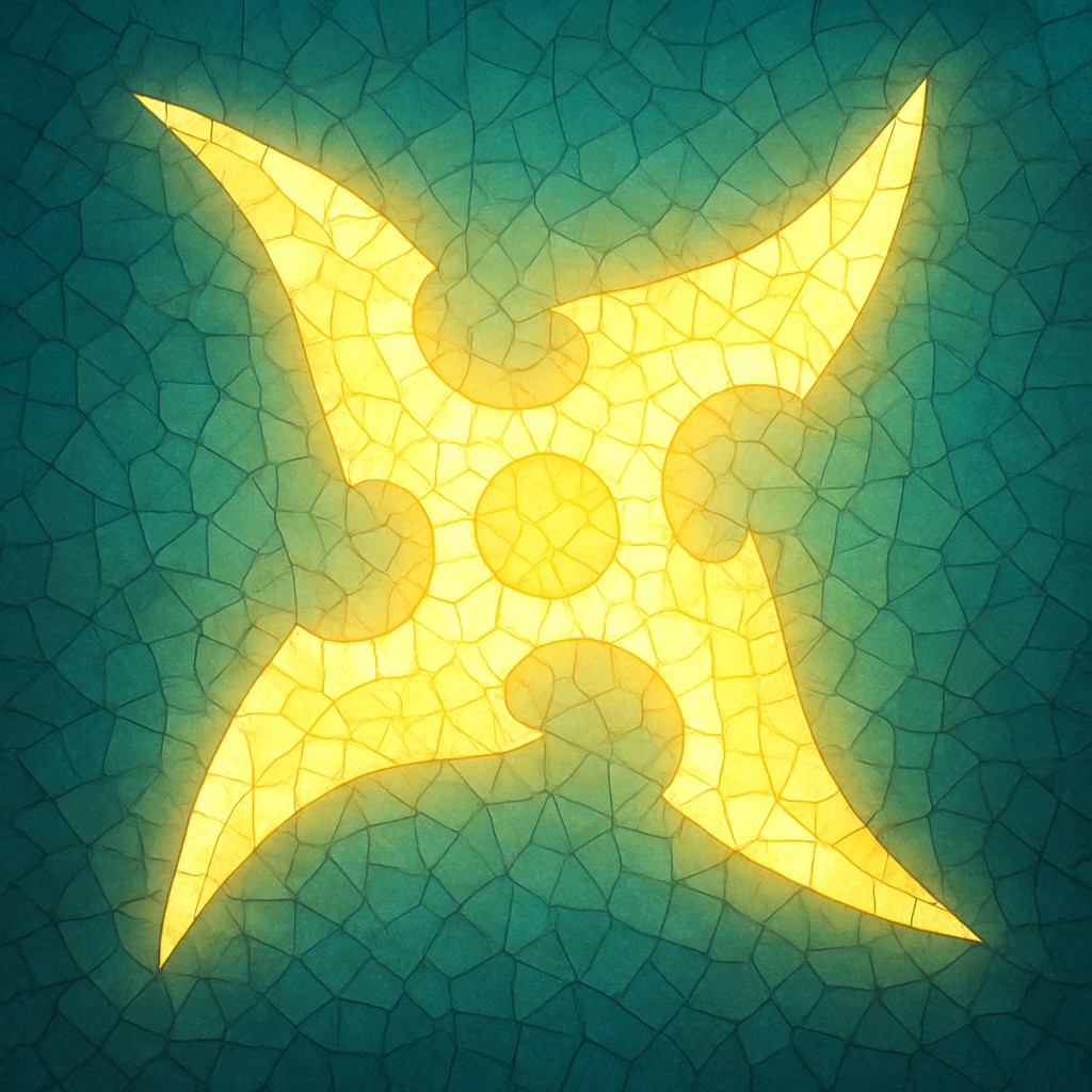The image shows a digital abstract mosaic in the shape of a shuriken (ninja star). The shuriken glows with radiant golden-yellow light, giving it the appearance of being forged from pure energy. Its four curved, sharpened blades form a symmetrical star pattern, with a circular center that enhances its balance and design. The mosaic style gives the surface a textured, stained-glass effect, where the glowing shards of light form the body of the weapon.