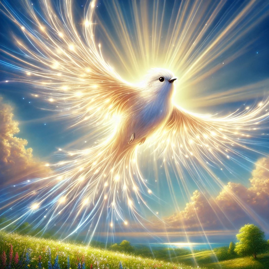 “A radiant light sparrow soaring through a sunlit sky. The sparrow’s body is composed of pure, glowing light, shimmering with hues of white and gold. Its feathers appear as streams of radiant light, and its eyes sparkle with a warm, golden glow. The background features a bright blue sky with soft, fluffy clouds and beams of sunlight breaking through.