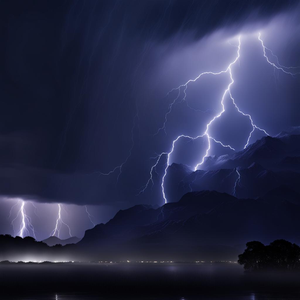 In the ink-black tapestry of the night, a sudden burst of brilliance fractured the darkness—a celestial symphony in a split second. The lightning strike painted the sky in electric veins, illuminating the landscape below. A transient tableau of jagged light captured the raw power of nature, etching a vivid and awe-inspiring memory.
