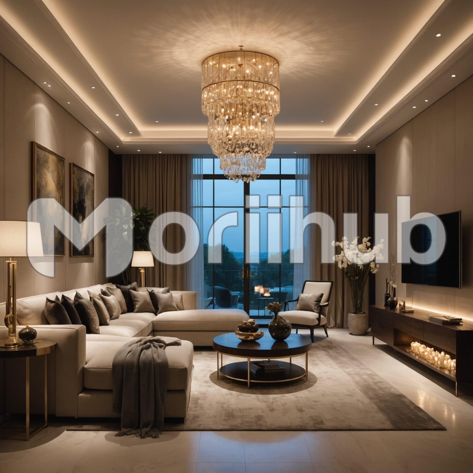 The living room is a blend of comfort and style, featuring a plush couch at its heart. In front of the couch, a coffee table holds a flower pot, adding a touch of nature to the space. An art frame adorns the wall behind the couch, enhancing the room’s aesthetic appeal. The TV mounted on the opposite wall is turned off, creating a peaceful atmosphere. Overhead, a chandelier adds a touch of elegance, casting a gentle glow that unifies the room’s warm and inviting ambiance.