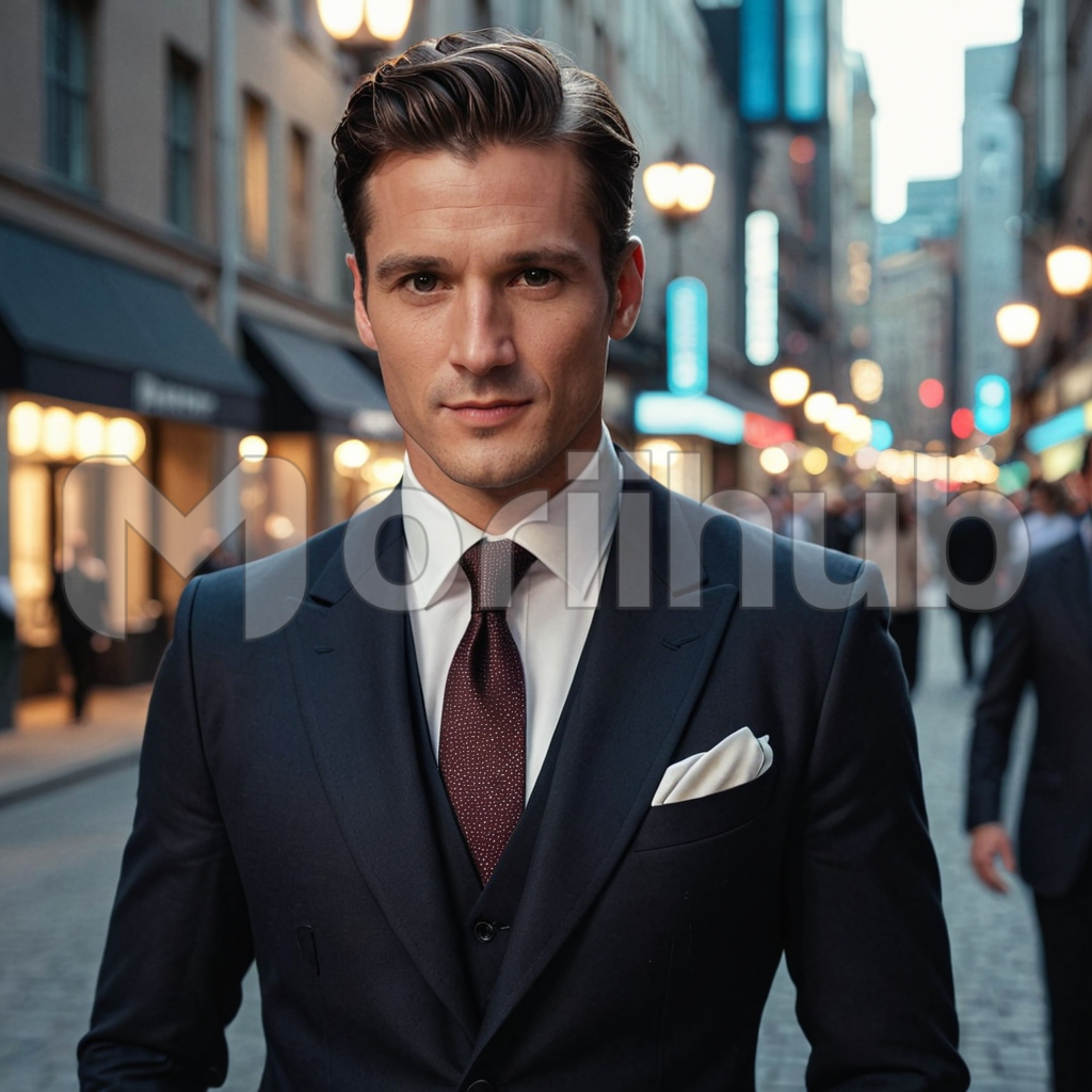 A man in a crisply tailored suit stands out amidst the flurry of a busy city street. His sharp attire contrasts with the diverse fashions of the bustling crowd behind him. Looking ahead with a resolute gaze, he exudes an air of determination and purpose. His tie is perfectly knotted, enhancing his professional demeanor. Around him, people hurry by, engrossed in their own worlds. This scene captures a moment of calm focus amidst the chaos of urban life.