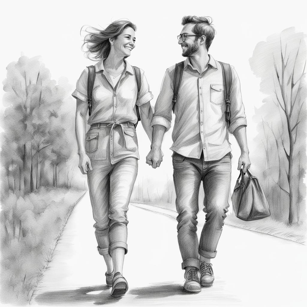 In this charming sketch, a couple strolls hand in hand along a winding path, surrounded by nature’s beauty. The artist skillfully captures the warmth of their connection, portraying shared laughter and a shared journey. The delicate lines evoke a sense of romance, with the couple immersed in a timeless, idyllic moment.