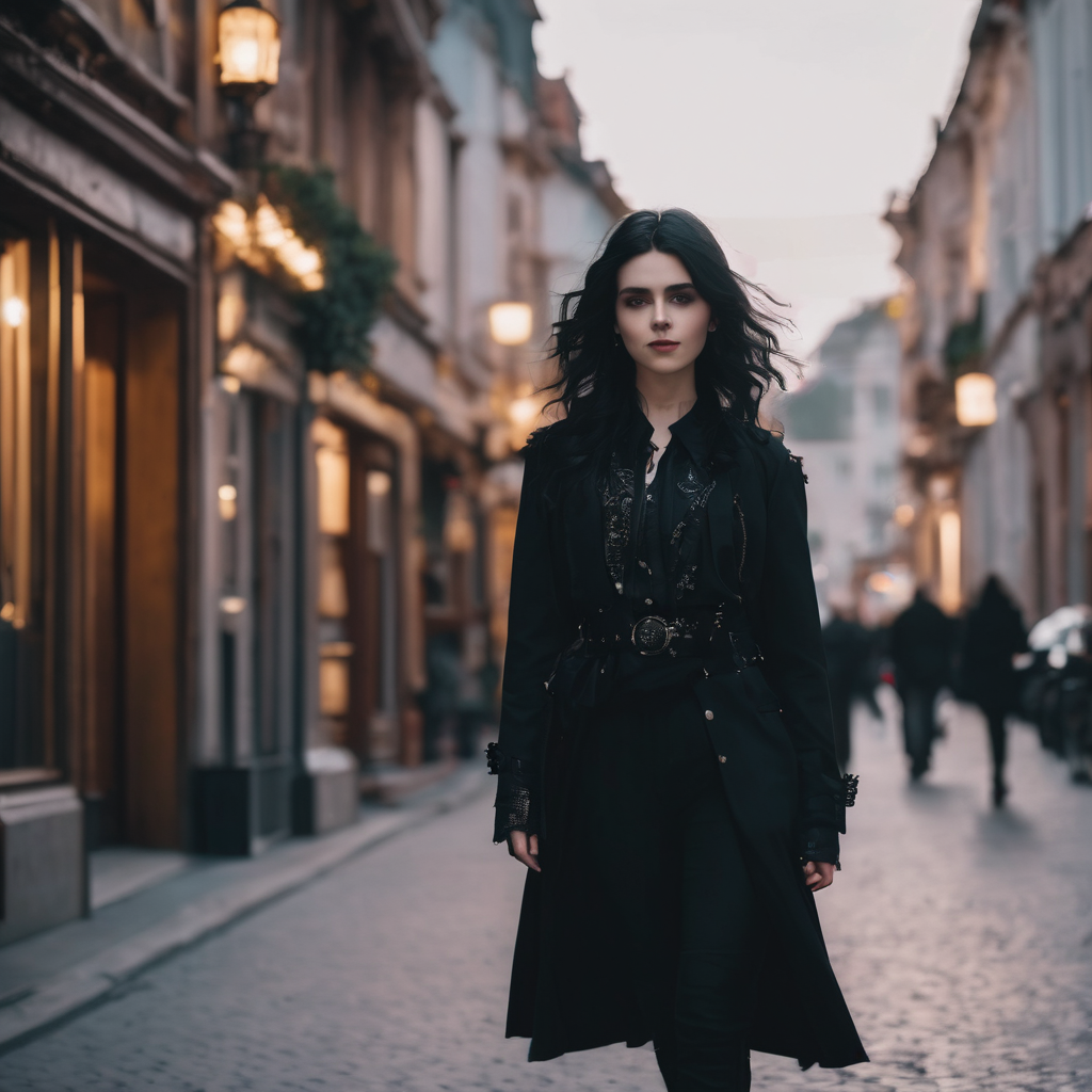 A stunning young woman, clad in all black, stands on the bustling city streets with an air of timeless elegance. Her gaze fixed ahead, she exudes confidence and mystery. The wind gently tousles her flowing black hair, framing her captivating presence. Pedestrians, mere silhouettes in her backdrop, move with the urban rhythm. In this urban vignette, the woman becomes a poetic contrast—a striking figure against the dynamic city canvas, an embodiment of grace and enigmatic allure.