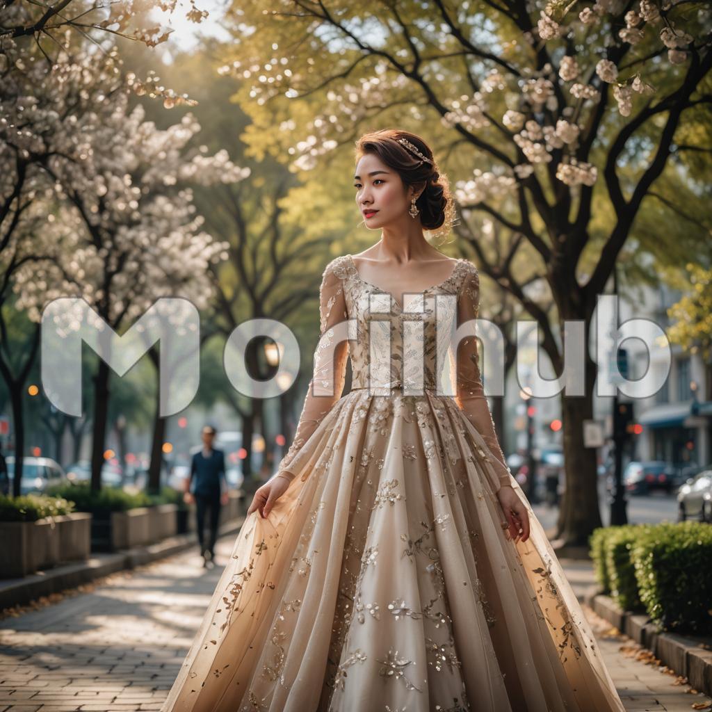 In an elegant ballroom, a lady graces the scene in a stunning gown, her presence a vision of refined beauty. The fabric cascades in luxurious folds, accentuating her graceful silhouette as she moves with poise and confidence. Adorned with jewels that sparkle like stars, she captivates all with her regal charm and timeless allure.