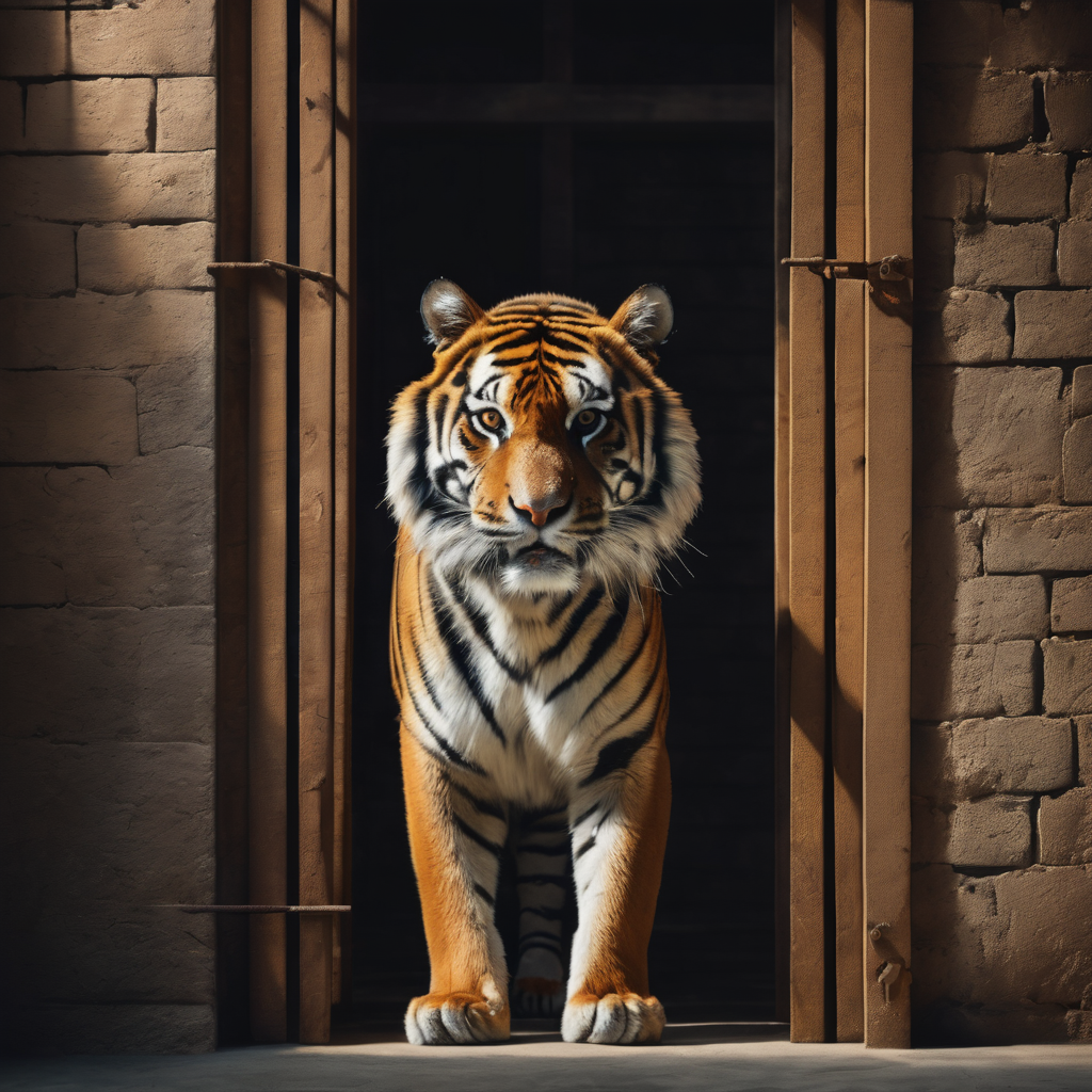 A majestic and powerful tiger, tamed through an extraordinary bond with its handler, exudes both strength and grace. Its sleek, orange-and-black striped coat shimmers in the sunlight, concealing the underlying muscular prowess. With eyes that mirror untamed wildness, it moves with a controlled elegance, a living testament to the harmonious connection between humanity and nature.