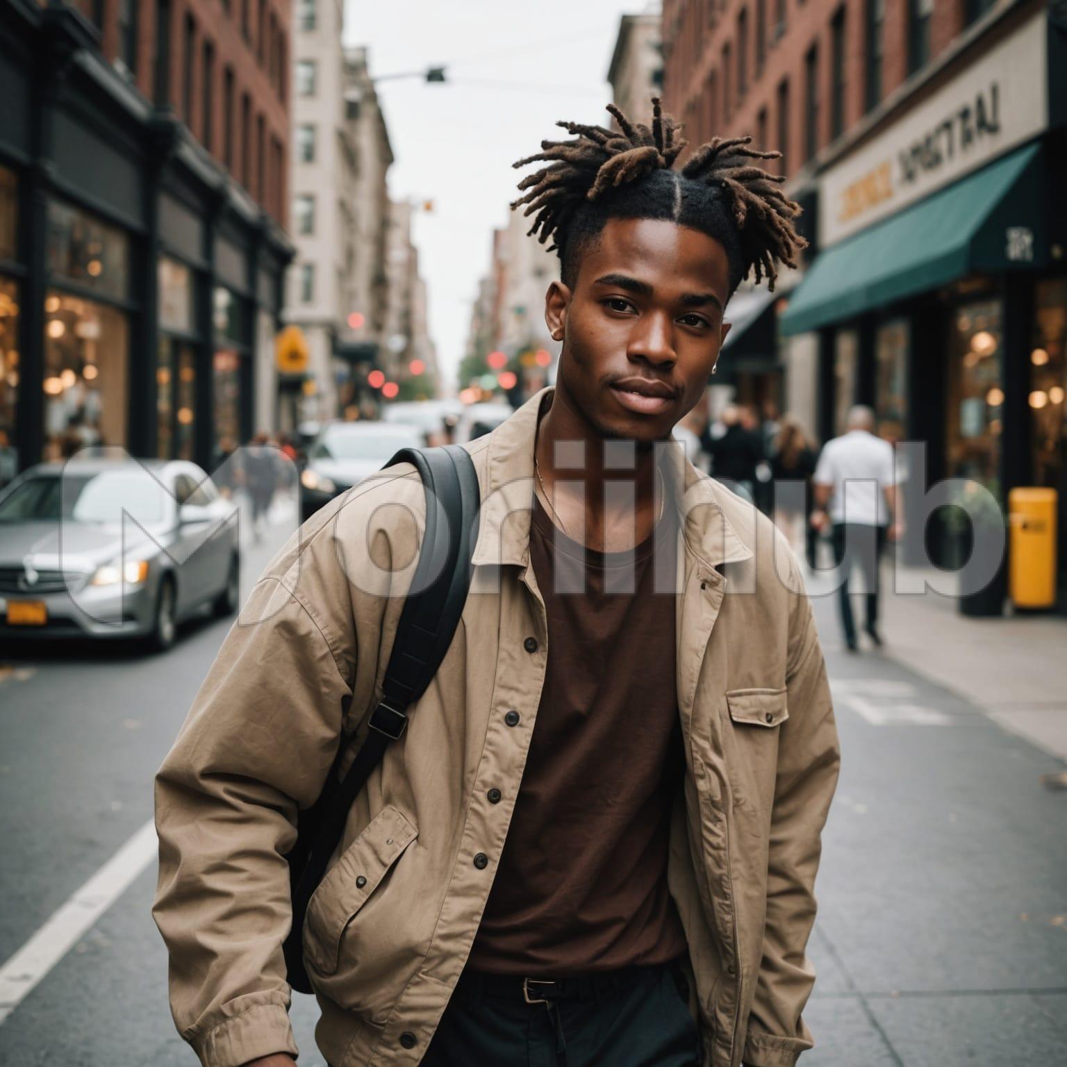 A young ebony man confidently walks down the bustling street, his stride purposeful and assured. People bustle behind him, caught in the ebb and flow of urban life. Cars glide along the road, their movement adding a rhythmic hum to the city soundtrack. Tall buildings line the street, casting shadows that dance across the pavement. Amidst this urban symphony, the young man’s presence stands out with quiet determination, blending effortlessly into the dynamic scene of pedestrians and vehicles navigating the busy cityscape.