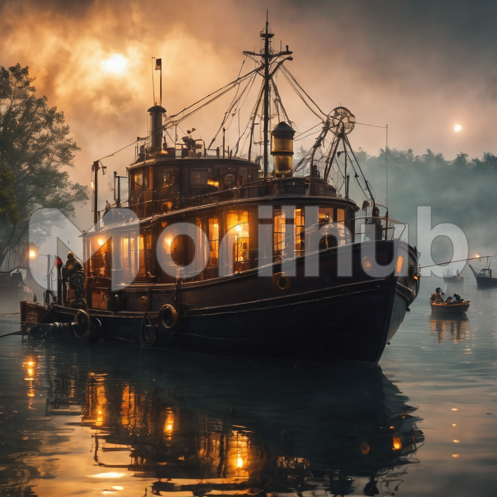 Under the night sky, a fishermen’s boat with shimmering lights creates a captivating scene on the darkened sea. The gentle waves reflect the glow, painting an ethereal picture. Silhouetted figures cast nets into the obsidian depths, their faces illuminated by the warm radiance. It’s a timeless tableau of tradition, resilience, and the quiet beauty of a seafaring life.