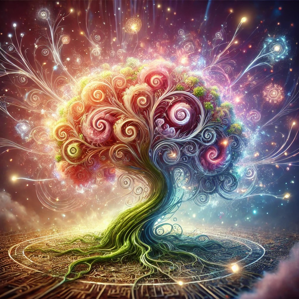 A mind bush with twisting, curling branches that resemble swirling patterns and glowing symbols, constantly shifting as though representing thoughts in motion. A soft, ethereal glow radiates from the bush, with tendrils of light extending outward, symbolizing the spread of ideas. The air around the bush shimmers with vibrant, dreamlike colors, creating a cerebral, mystical atmosphere.