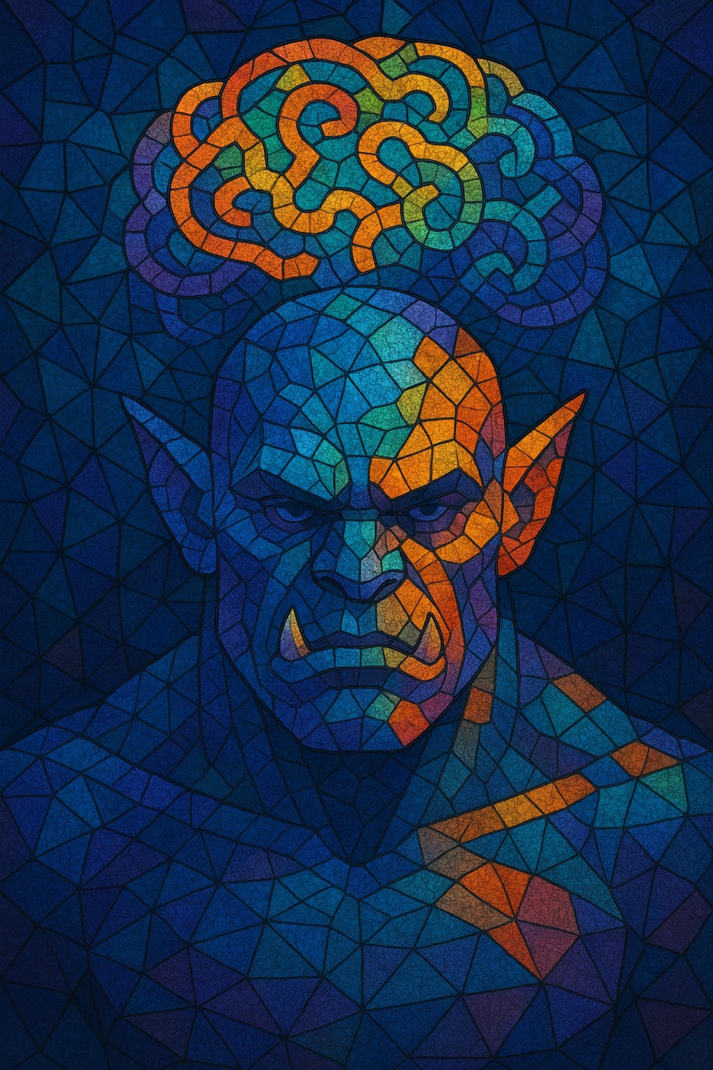 This digital abstract mosaic portrays a powerful orc figure rendered in a stained-glass style, composed of vibrant geometric shards. The orc’s stern, expressive face is defined by bold contours and angular features, with glowing eyes and prominent tusks exuding intensity. A swirling, brain-like formation hovers above the orc’s head, symbolizing the “mind” element — an unusual and striking contrast to the brute strength typically associated with orcs.