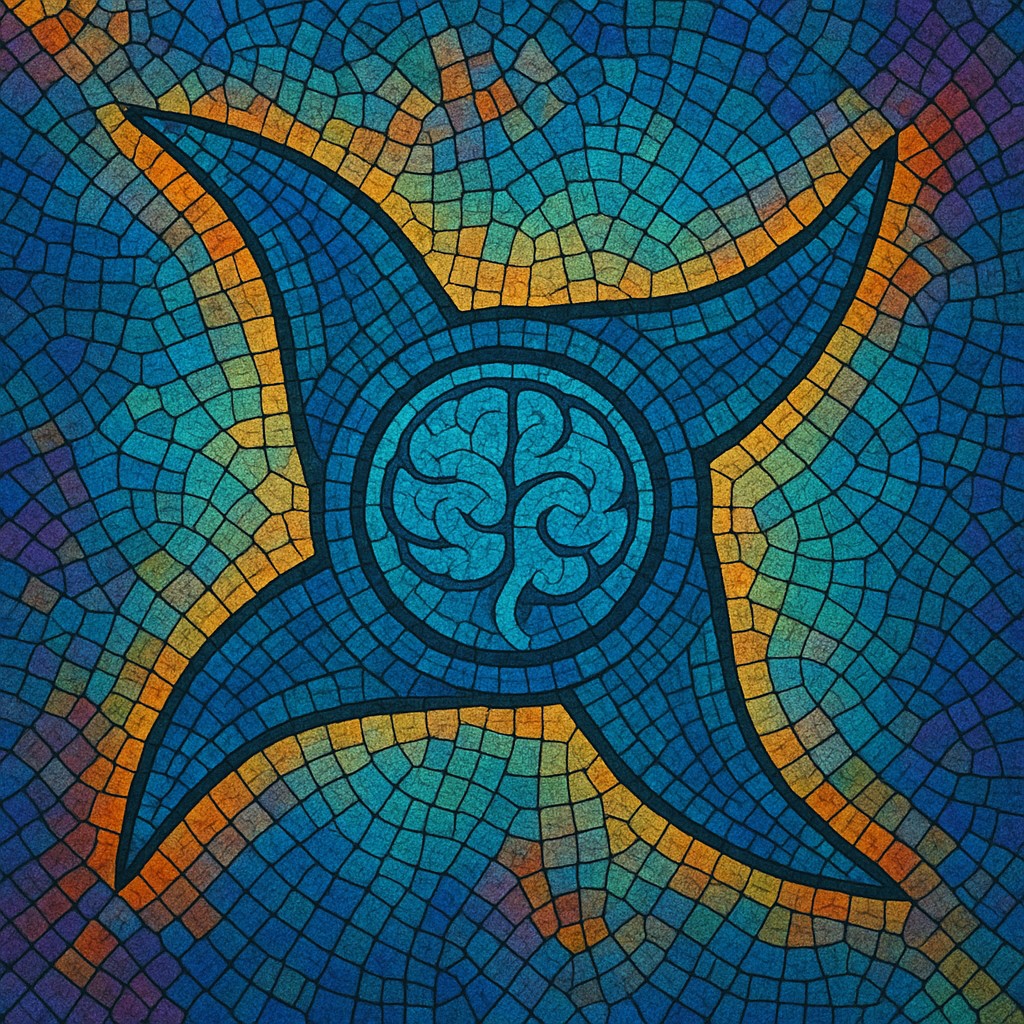 This image is a digital abstract mosaic in the shape of a shuriken (a four-pointed throwing star), infused with the “mind” element theme. The design is composed of small, irregularly shaped tiles that form a stained-glass-like texture. The color palette is dominated by blues, teals, and turquoise, representing clarity and intellect. At the center of the shuriken, there’s a stylized brain icon, symbolizing the “mind” element.