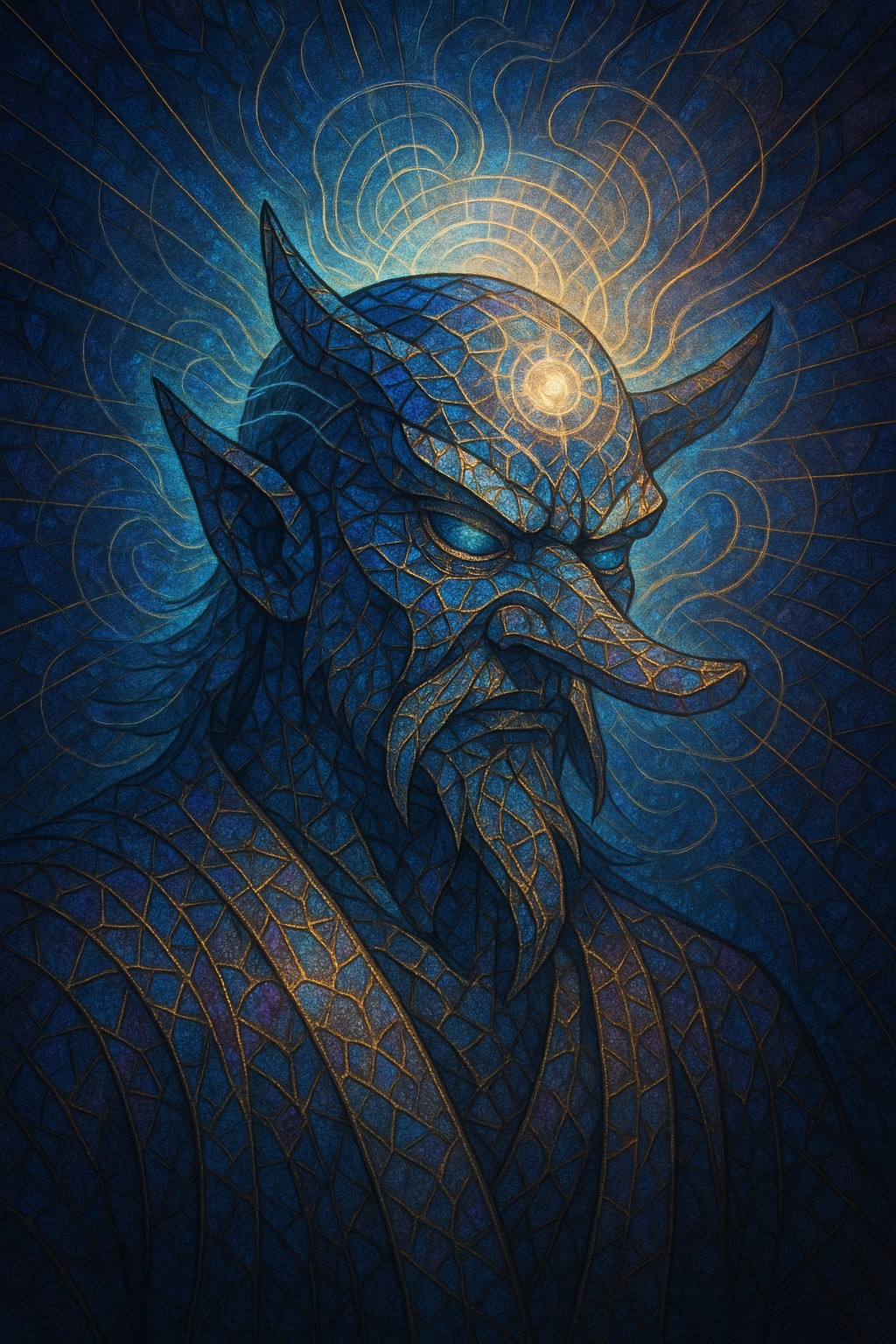 This artwork depicts a majestic tengu rendered in a luminous, abstract mosaic style reminiscent of stained glass. Intricately interlocking shards of deep blues, purples, and shimmering golds form its angular features, with the long beak, pointed ears, and sharp gaze characteristic of the mythical creature. The “mind element” theme radiates from a glowing point on the tengu’s forehead, where golden light spills outward in delicate, swirling lines, evoking waves of thought and spiritual energy.