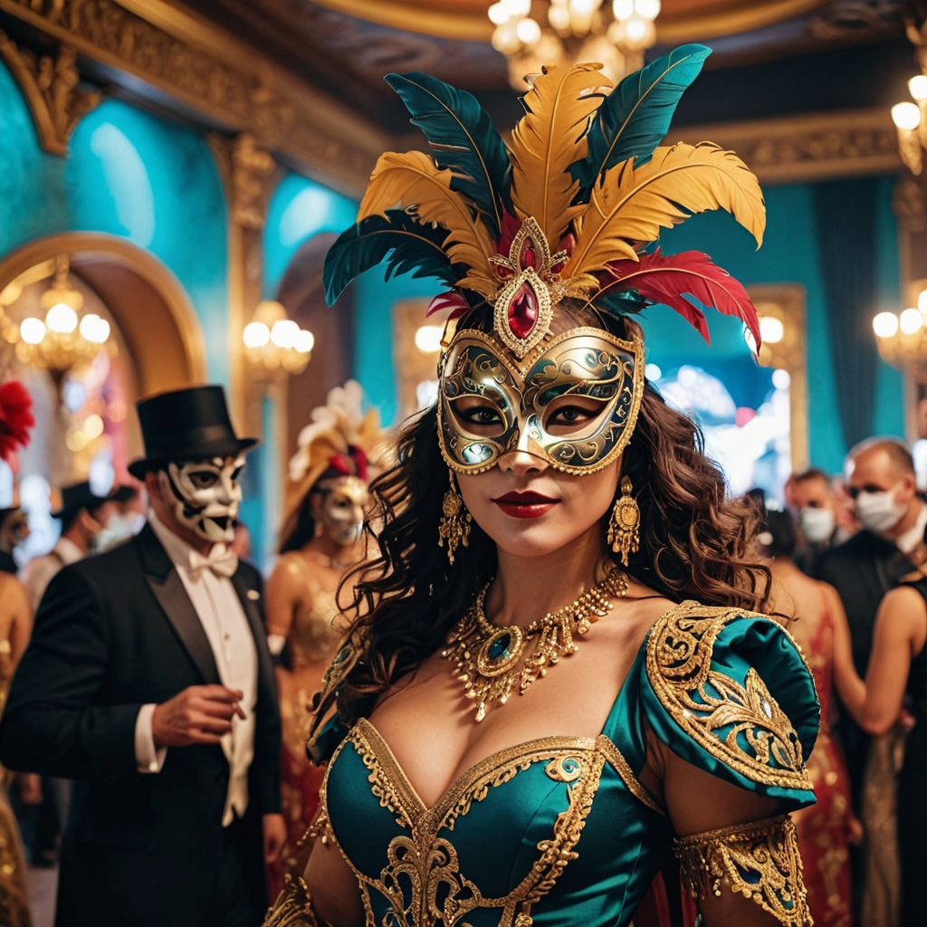 In the opulent masquerade ball, a woman dons an intricately crafted mask, concealing her identity with an air of mystery. Behind her, a sea of masked revelers adds to the allure of the event, their elaborate disguises hinting at hidden desires and secrets. With each graceful movement, the woman exudes elegance and intrigue, captivating all who gaze upon her enigmatic presence amidst the enchanting ambiance of the ballroom.