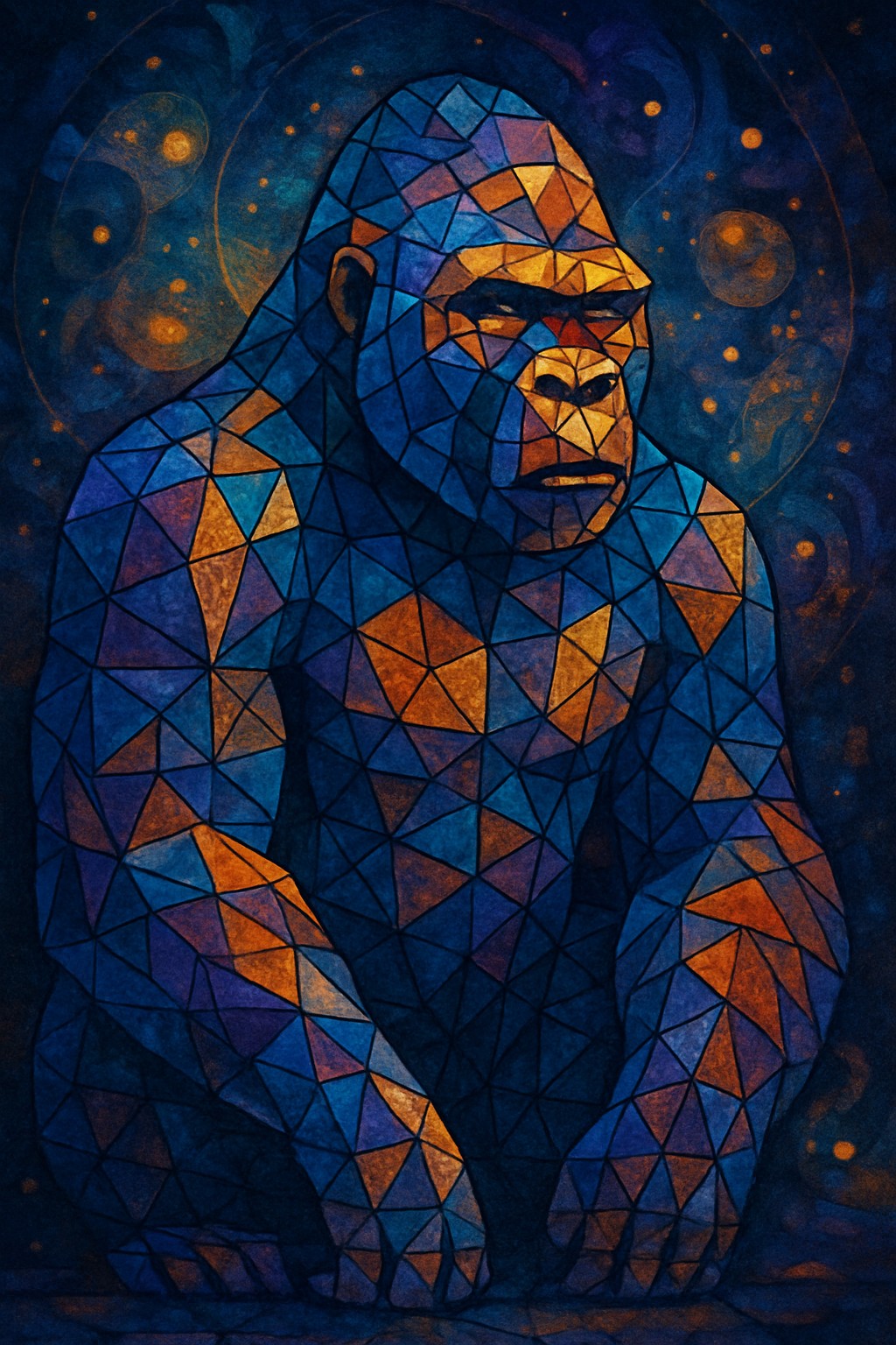 This image is a digital abstract mosaic in the shape of a gorilla, infused with a mystic, cosmic theme. The gorilla’s form is constructed entirely from angular geometric shapes—mostly triangles—in a stained-glass style. Vivid hues of blue, purple, orange, and gold flow across its body, creating a vibrant and dimensional appearance.